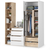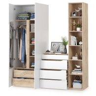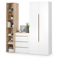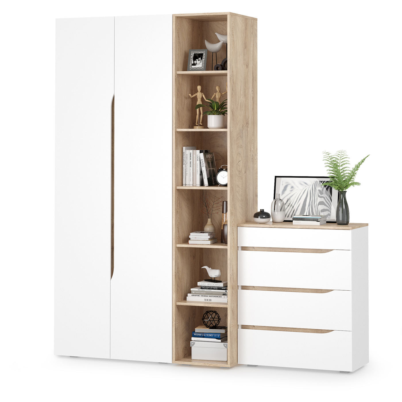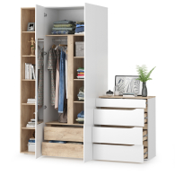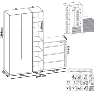 За распашными дверками шкафа оборудованы три отделения - нижнее с ящиками, верхнее с антресольной полкой и центральное со штангой для одежды на вешалках и полками. Два вместительных внутренних ящика на шариковых направляющих послужат отличным комодиком для деликатных вещей и белья. Центральное отделение со штангой для одежды на вешалках и полками может быть собрано на любую сторону. На обратной стороне двери размещается зеркало. Компактный Ком с четырьмя вместительными выдвижными ящиками на шариковых направляющих полного выдвижения. У фасадов нет фурнитуры, она заменена стильными ручками-вырезами. Вырезы делают внешний вид изделий асимметричным, что делает композицию современной и динамичной. Стеллаж оборудован пятью поками для хранения вещей и элементов декора. Установлены на пластиковые опоры защищая поверхность пола от механических повреждений. Выполнен из прочной ламинированной ДСП 16 мм, торцы деталей закромлены плёнкой ПВХ 0,4-2 мм. Поставляются в разобранном виде, надёжно упакованной в гофрокартон, с приложенной подробной инструкцией по сборке. Шкаф с открытым стеллажом и комодом Муссон - элементы из набора мебели для спальни Муссон.