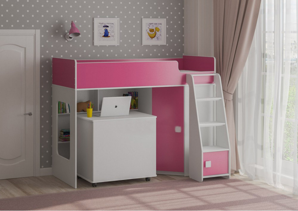 Кровать чердак Л-42.2.6 – великолепный комплект мебели с выдвижным столом. Комплект занимает немного места - решение для площади малых габаритов,экономия пространства. Кровать чердак с большим спальным местом 1750×750. Высота кровати чердака всего 1405 мм, что легко позволит взрослым наблюдать за ребенком на кровати или достать что-то с верхнего яруса. Встроенный угловой шкаф - невероятно вместительный за счет угловой конструкции. В нём будет много места для хранения белья, игрушек или иных вещей! В комплект входит комфортный письменный стол Л-02, оборудованный поворотными колесами. Стол легко перемещается по полу,задвигается и выдвигается. Прямая лестница имеет место для хранения, с дверкой и ручкой плавной формы. Внизу располагается игровая зона с полками – свой уголок для ребенка. Световое окно прямоугольной формы неспроста расположено очень низко – ребенок легко сможет попасть в свой игровой домик или вылезти из него через это окошко. В этой модели совсем нет острых углов! Все линии плавные,что не только выглядит красиво и современно,но и обеспечивает еще больше безопасности. Мягкий противоударный кант – обеспечивает безопасность для Ваших детей! Все детали в цвете Лайм, Розовый, Ирис, Оранжевый, Синий производятся со светло-бежевой кромкойПо вашему выбору комплект может быть собран как на левую, так и на правую сторону.