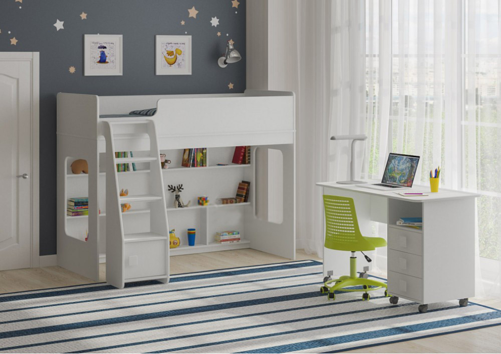 Кровать чердак Л-42.3.7 – великолепный комплект мебели с выдвижным столом. Комплект занимает немного места - решение для площади малых габаритов,экономия пространства. Кровать чердак с большим спальным местом 1750×750. Высота кровати чердака всего 1405 мм, что легко позволит взрослым наблюдать за ребенком на кровати или достать что-то с верхнего яруса. Большой письменный стол Л-03 оборудован поворотными колесами,легко перемещается по полу, задвигается и выдвигается. Три выкатных ящика стола обеспечат удобное хранение канцелярии,письменных, учебных и прочих принадлежностей. Прямая лестница имеет место для хранения, с дверкой и ручкой плавной формы. Внизу располагается игровая зона с полками – свой уголок для ребенка. Световое окно прямоугольной формы неспроста расположено очень низко – ребенок легко сможет попасть в свой игровой домик или вылезти из него через это окошко. В этой модели совсем нет острых углов! Все линии плавные,что не только выглядит красиво и современно,но и обеспечивает еще больше безопасности. Мягкий противоударный кант – обеспечивает безопасность для Ваших детей! Все цветные фасады производятся со светло-бежевой кромкой.По вашему выбору комплект может быть собран как на левую, так и на правую сторону.