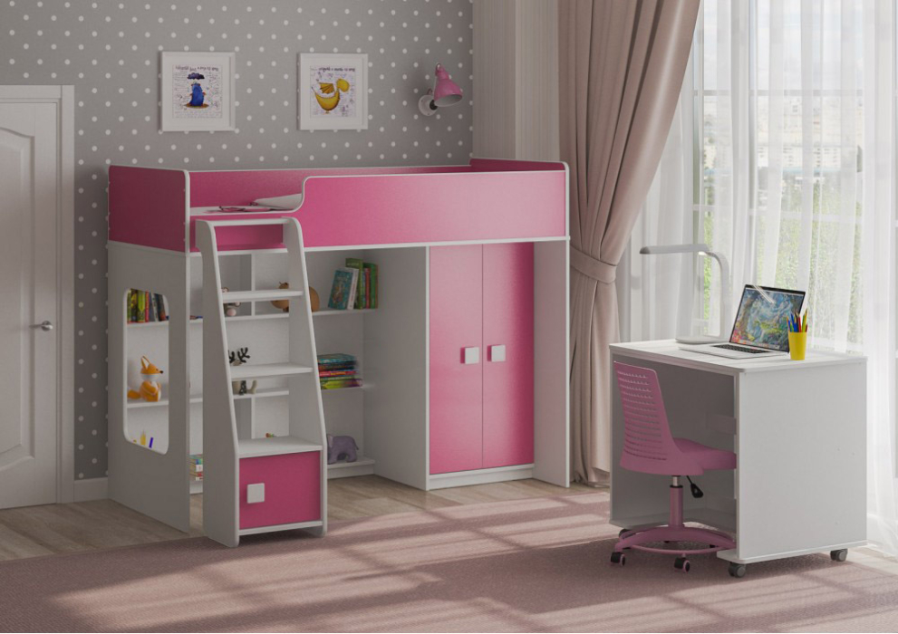Кровать чердак Л-42.1.5 – великолепный комплект мебели с компактным выдвижным столом Л-02. Подойдет даже для очень маленьких пространств - экономия мест и очень продуманная планировка. Спальное место 1750х750. Высота чердака всего 1405мм, что легко позволит взрослым наблюдать за ребенком на кровати или достать что-то с верхнего яруса. Внизу располагается игровая зона с полками – свой уголок для ребенка. Встроенный шкаф послужит для организации хранения вещей (детской одежды, белья) и игрушек. Комфортный письменный стол Л-02 оборудован поворотными колесами,легко перемещается по полу, задвигается и выдвигается. Световое окно прямоугольной формы неспроста расположено очень низко – ребенок легко сможет попасть в свой игровой домик или вылезти из него через это окошко. Прямая лестница имеет место для хранения, с дверкой и ручкой плавной формы, без острых углов. В этой модели совсем нет острых углов! Все линии плавные, что не только выглядит красиво и современно, но и обеспечивает еще больше безопасности. Мягкий противоударный кант – обеспечивает безопасность для Ваших детей!По вашему выбору комплект может быть собран как на левую, так и на правую сторону.