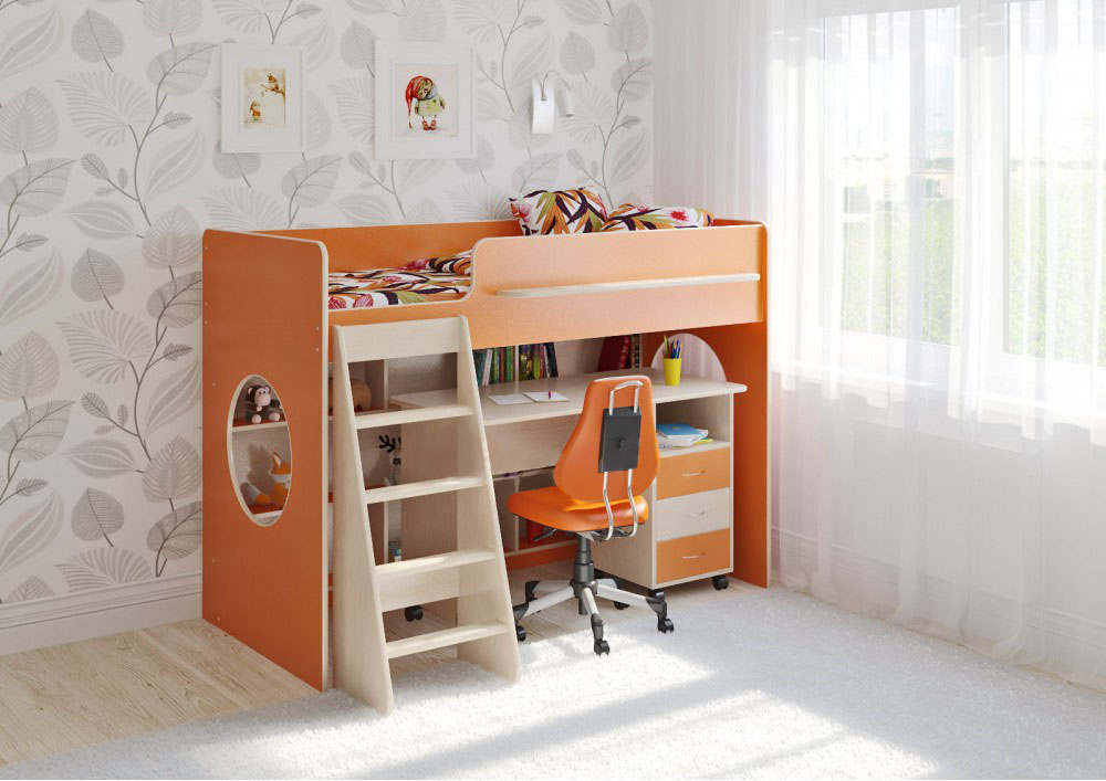 Кровать чердак Л-26.6 - удобный комплект мебели со столом. Комплект занимает немного места - решение для площади малых габаритов, экономия пространства. В комплект входит: Кровать с большим спальным местом 1800х800.Маленькая полочка на верхнем бортике удобна для мелочей. Под спальным местом располагается игровая зона – свой уголок для ребенка. В игровой зоне располагается стеллаж, отлично подходящий для хранения игрушек. Стеллаж состоит из трех уровней, верхний и нижний уровни разделены на 3 секции, а средний – на 2.Итого 8 секций – удобно для поддержания порядка и сортировки предметов. Два световых окна - дополнительное освещение. В настоящее время световое окно выполнено в форме квадрат см. схему изделия. Высота кровати – всего 1350мм.Удобно - взрослый может заправить кровать, не забираясь на второй ярус! Второй ярус на уровне роста взрослого человека – гарантия свежего воздуха для ребенка. В этой модели совсем нет острых углов! Все линии плавные, что не только выглядит красиво и современно, но и обеспечивает еще больше безопасности. Устойчивая лестница со ступенями из массива сосны – четыре широких удобных ступеньки, хороший безопасный наклон. Комфортный письменный стол оборудован поворотными колесами, легко перемещается по полу, задвигается и выдвигается. Три выкатных ящика стола обеспечат удобное хранение канцелярии, письменных, учебных и прочих принадлежностей. Над ящиками открытая полка для мелочей, которые будут всегда под рукой. Мягкий противоударный кант – дополнительная безопасность для детей. Все цветные фасады производятся со светло-бежевой кромкой. Для вашего удобства во всех изделиях все бортики спального места можно менять местами. По вашему выбору комплект может быть собран как на левую, так и на правую сторону.