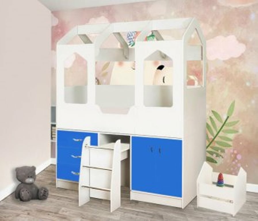 Кровать чердак Домик Сказка с выдвижным столом ДС-14 Белый (Синий)