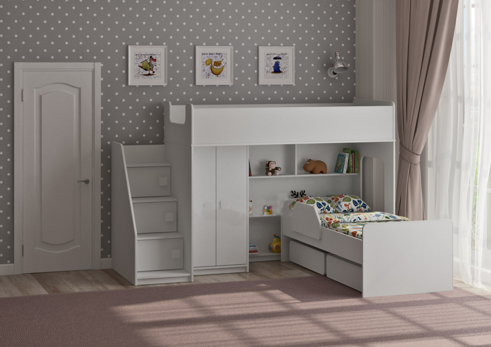 Двухъярусная кровать Л-43.1.2 – прекрасный комплект мебели для двоих детей. Комплект занимает немного места - решение для площади малых габаритов, экономия пространства. Двухъярусная кровать двумя перпендикулярными спальными местами - 1750х750 и 1600х700 мм. Высота кровати – всего 1405 мм. Удобно - взрослый может заправить кровать, не забираясь на второй ярус. Интегрированная угловая лестница оснащена боковым бортиком и местами для хранения с ручками плавной формы, без острых углов. Встроенный шкаф послужит для организации хранения вещей (детской одежды, белья) и игрушек. Под верхним спальным местом располагается стеллаж,отлично подходящий для хранения игрушек. Под нижней кроватью Л- 27.1 два вместительных ящика, которые разработаны специально для данной модели. Идеально помещаются под кроватью, удобно выкатываются и закатываются. Незаменимые элементы организации хранения вещей. Нижняя кровать оборудована бортиком безопасности Л-01. В этой модели совсем нет острых углов! Все линии плавные, что не только выглядит красиво и современно, но и обеспечивает еще больше безопасности. Мягкий противоударный кант – обеспечивает безопасность для Ваших детей! По вашему выбору комплект может быть собран как на левую, так и на правую сторону.