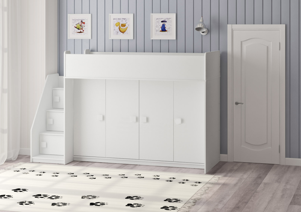 Комплект занимает немного места - решение для площади малых габаритов, экономия пространства. Спальное место 1750х750. Интегрированная угловая лестница оснащена боковым бортиком и местами для хранения с ручками плавной формы, без острых углов. Внизу под спальным местом располагается черырёхстворчатый шкаф, в середине объемный отдел со штангой для одежды,по бокам два отдела с полками для хранения белья, игрушек или иных вещей! В этой модели совсем нет острых углов! Все линии плавные, что не только выглядит красиво и современно,но и обеспечивает еще больше безопасности. Мягкий противоударный кант – обеспечивает безопасность для Ваших детей! Цвет кромки на цветных фасадах - бежевый По вашему выбору комплект может быть собран как на левую, так и на правую сторону.