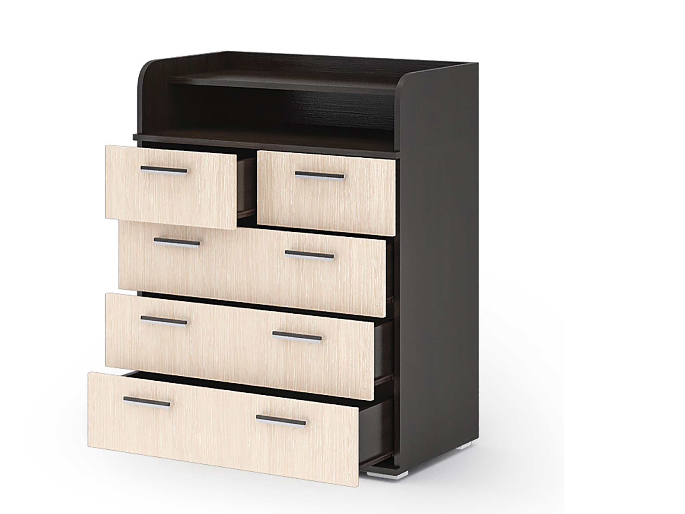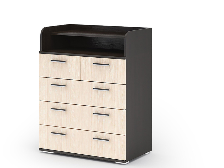 Комод №1 станет гармоничным дополнением интерьера любой комнаты. Пять (два малых и три больших) достаточно вместительных выдвижных ящика пригодятся для хранения одежды, постельного и нижнего белья, различных аксессуаров, косметики и украшений. Сверху на комоде можно разместить интересные книги, семейные фотографии, вазу или вазон с цветами, статуэтки и другие предметы декора. Направляющие ящиков - роликовые. Материал: ЛДСП. Ручки: пластик 128мм. Опора: пластик