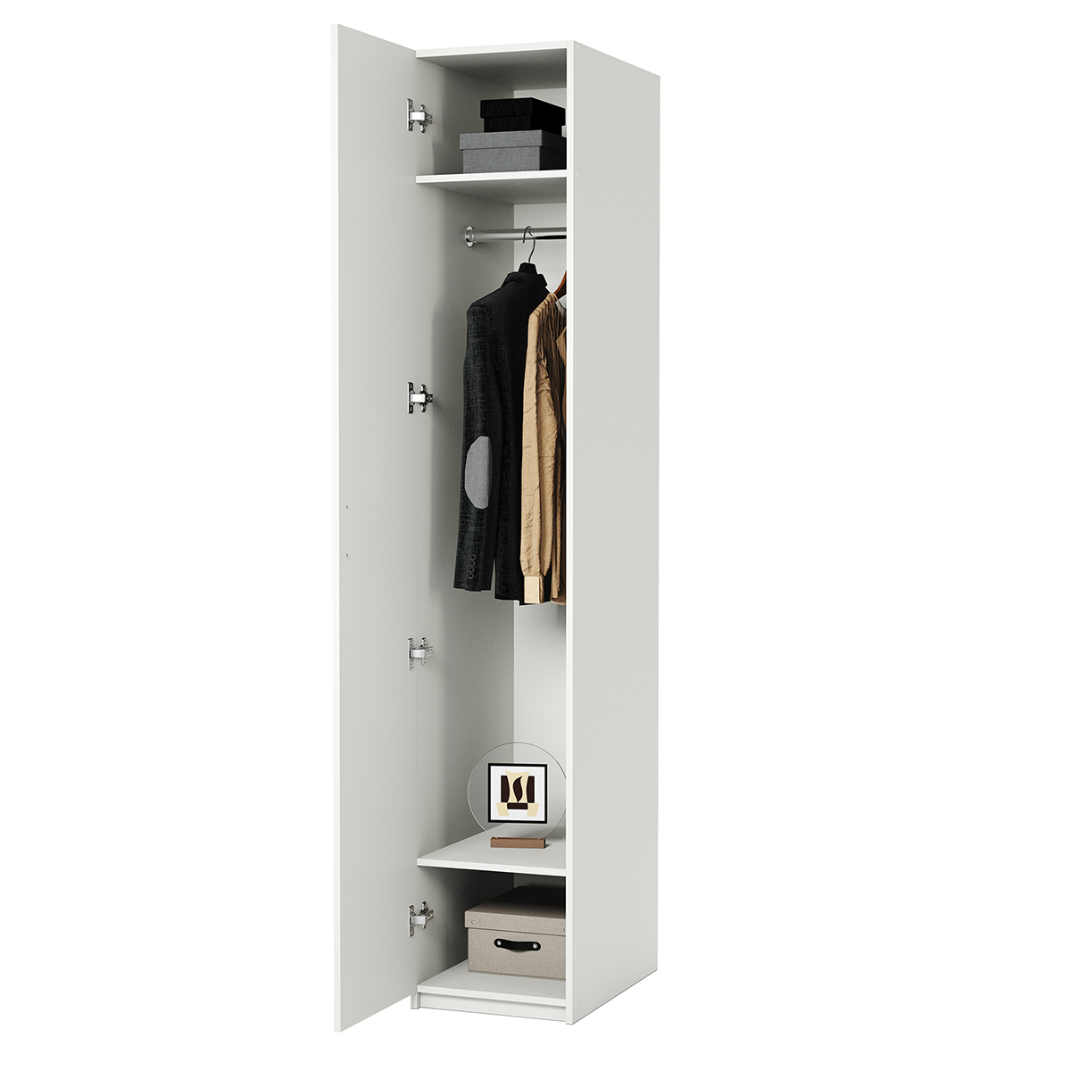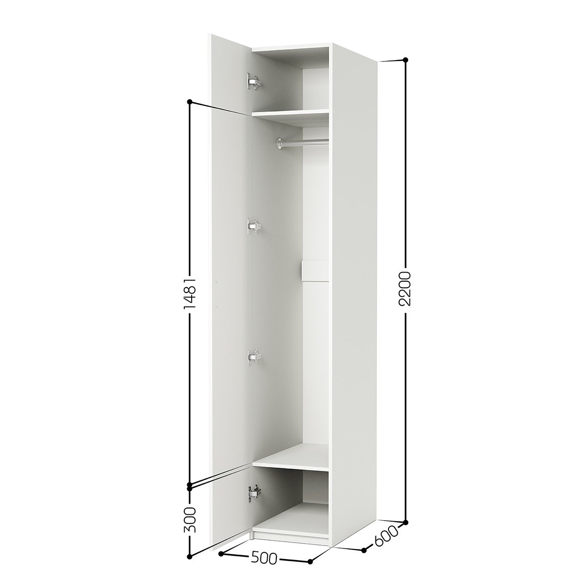 Габариты внешние: ширина 500 мм. глубина 600 мм. высота 2200 мм. Изделие выполнено из высококачественной ЛДСП отечественного производства. Края отделаны кромкой ПВХ 2 мм. Изделие поставляется в разобранном виде. В комплект входит инструкция. Корпус ламинированная ДСП, Задняя стенка ДВП, Тип шкафа линейный (прямой) Гарантийный срок (мес) 18 , Количество распашных дверей 1 Штанга для одежды шт. 1.Наполнение полки и штанга, Вес (кг) 60, Обём (м³) 0.26, Количество упаковок 1, Толщина корпуса 16мм, Количество секций 1, Фасады дверей ЛДСП.