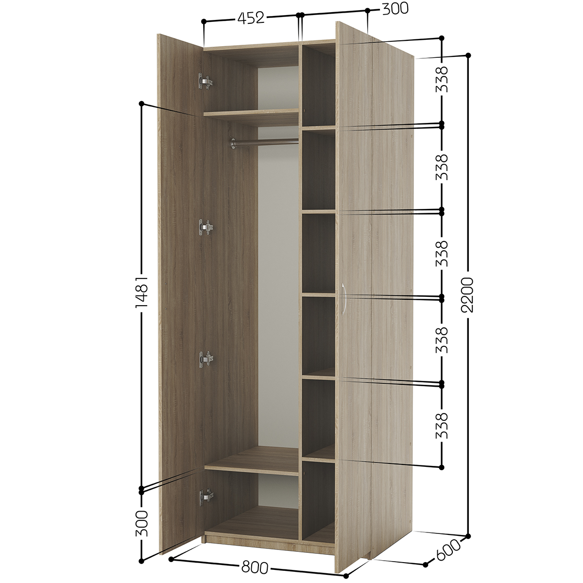 Габариты внешние: ширина 800 мм. глубина 600 мм. высота 2200 мм., Наполнение шкафа комбинированный полки и штанга. Изделие выполнено из высококачественной ЛДСП отечественного производства. Края отделаны кромкой ПВХ 2 мм. Изделие поставляется в разобранном виде. В комплект входит инструкция. Корпус ламинированная ДСП, Задняя стенка ДВП, Тип шкафа линейный (прямой) Гарантийный срок (мес) 18 , Количество распашных дверей 2 Штанга для одежды шт. 1.Наполнение полки и штанга, Вес (кг) 80, Обём (м³) 0.42, Количество упаковок 3, Толщина корпуса 16мм, Количество секций 2, Фасады дверей ЛДСП.