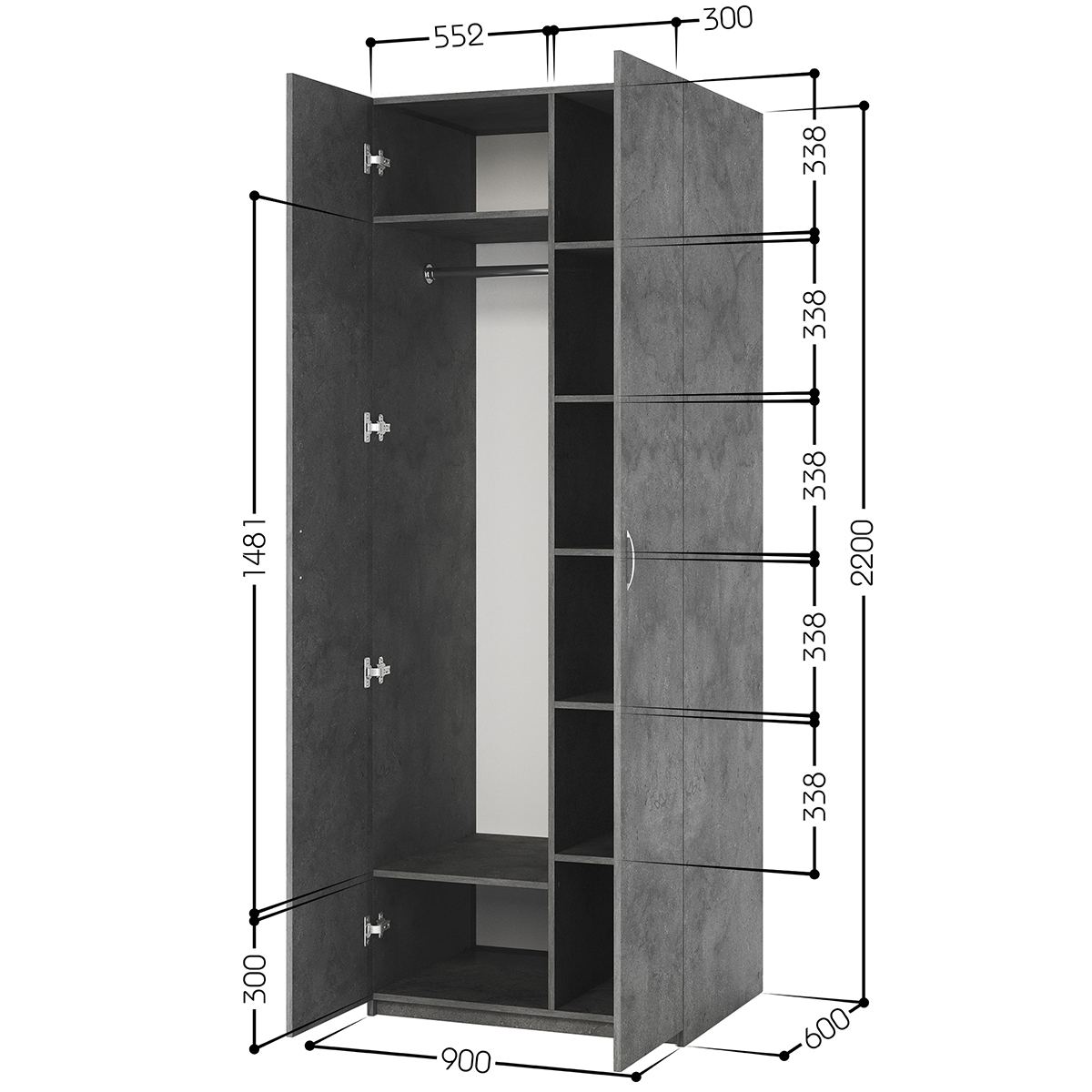 Габариты внешние: ширина 900 мм. глубина 600 мм. высота 2200 мм., Наполнение шкафа комбинированный полки и штанга. Изделие выполнено из высококачественной ЛДСП отечественного производства. Края отделаны кромкой ПВХ 2 мм. Изделие поставляется в разобранном виде. В комплект входит инструкция. Корпус ламинированная ДСП, Задняя стенка ДВП, Тип шкафа линейный (прямой) Гарантийный срок (мес) 18 , Количество распашных дверей 2 Штанга для одежды шт. 1.Наполнение полки и штанга, Вес (кг) 85, Обём (м³) 0.45, Количество упаковок 3, Толщина корпуса 16мм, Количество секций 2, Фасады дверей ЛДСП.
