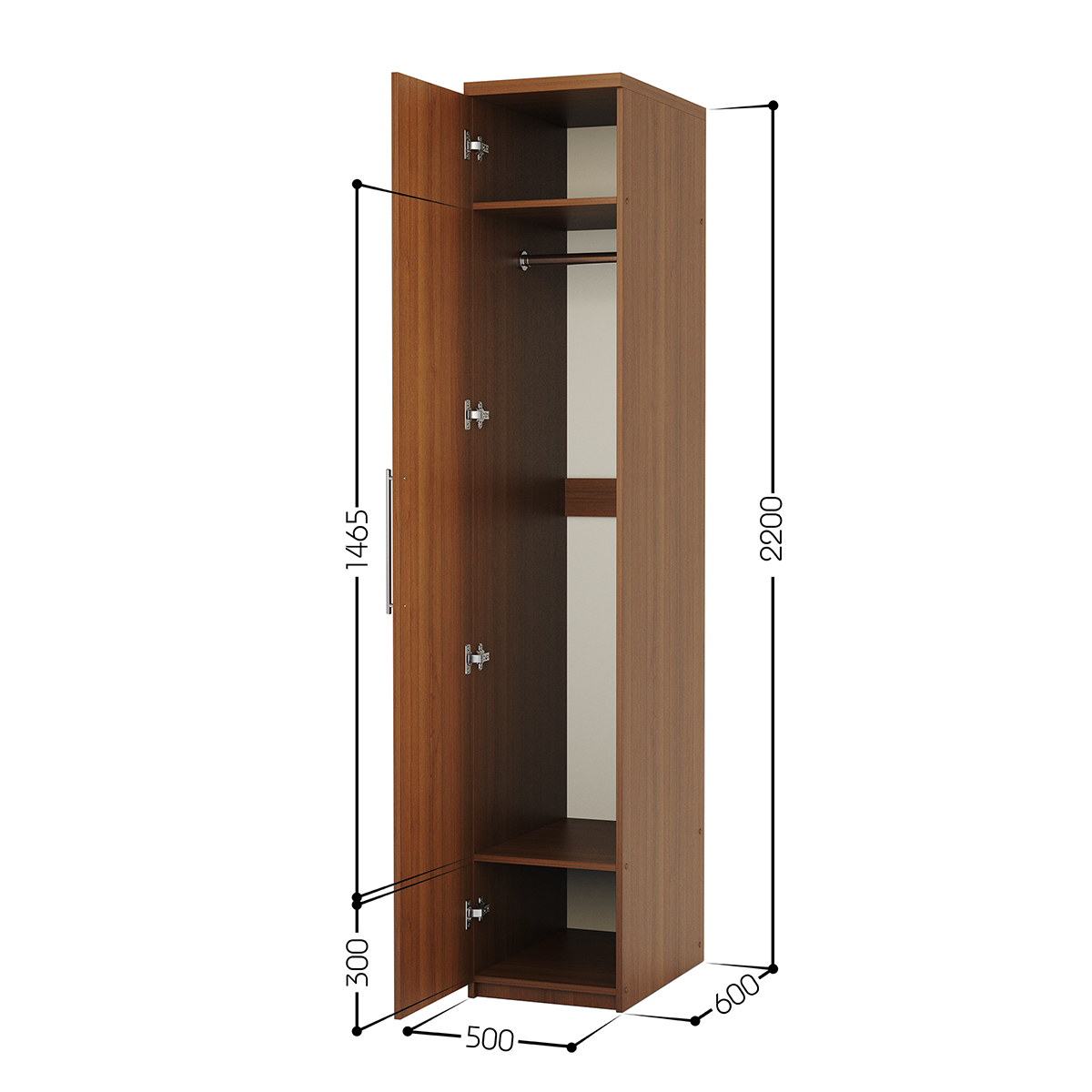Габариты внешние: ширина 500 мм. глубина 600 мм. высота 2200 мм., Гарантия: 18 месяцев, Штанга для вешалок: да, Страна производства: Россия, Материал корпуса: ЛДСП, Количество дверей: 1.Зеркало в дверце: нет, Тип шкафа: для одежды, Требуется сборка: да. Изделие выполнено из высококачественной ЛДСП отечественного производства. Края отделаны кромкой ПВХ 2 мм. Изделие поставляется в разобранном виде. В комплект входит инструкция. Корпус ламинированная ДСП, Задняя стенка ДВП, Тип шкафа линейный (прямой).