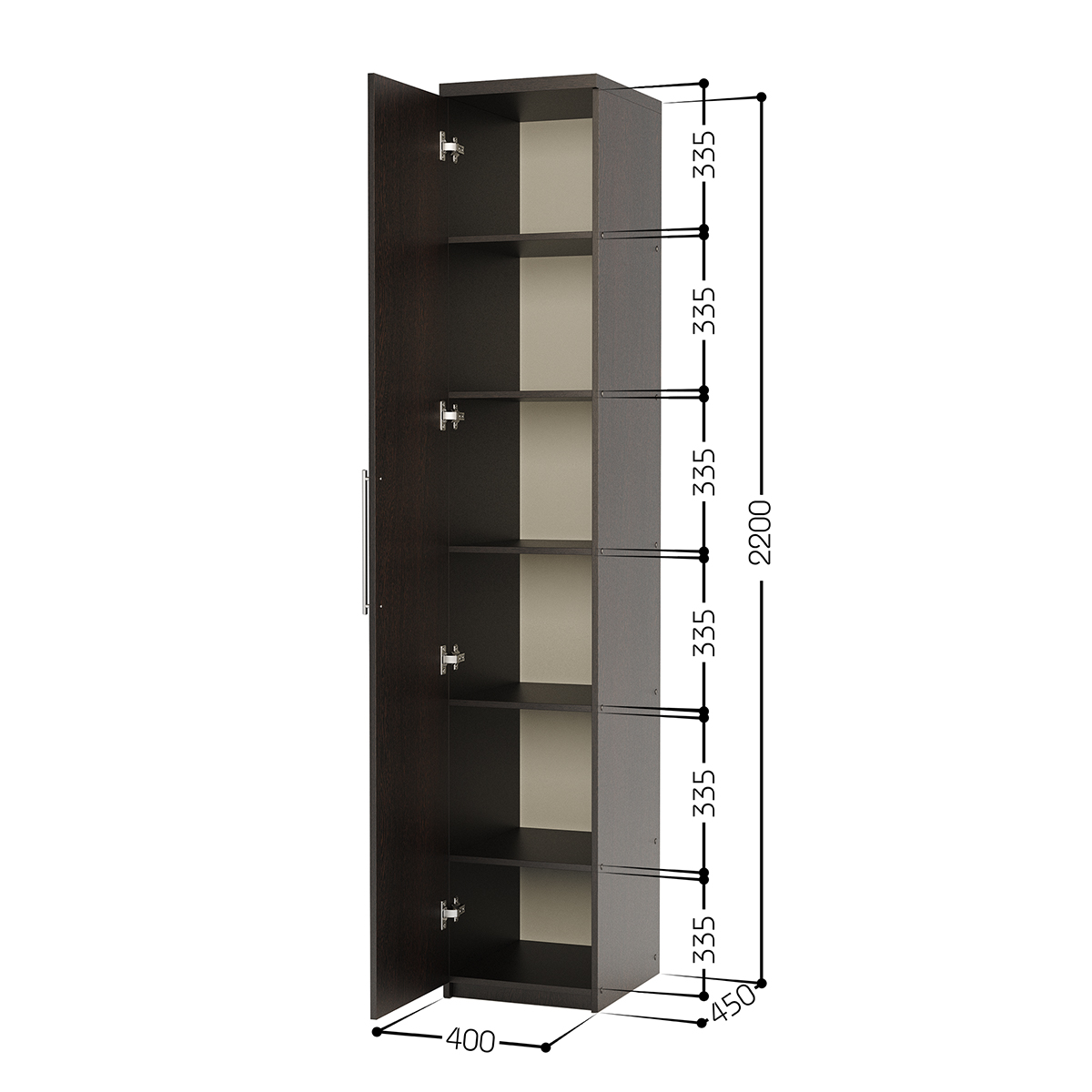 Габариты внешние: ширина 400 мм. глубина 450 мм. высота 2200 мм. Гарантия: 18 месяцев, Штанга для вешалок: нет, Страна производства: Россия, Материал корпуса: ЛДСП, Количество дверей: 1,Зеркало в дверце: нет, Тип шкафа: для белья, Требуется сборка: да. Изделие выполнено из высококачественной ЛДСП отечественного производства. Края отделаны кромкой ПВХ 2 мм. Изделие поставляется в разобранном виде. В комплект входит инструкция. Корпус ламинированная ДСП, Задняя стенка ДВП, Тип шкафа линейный (прямой).
