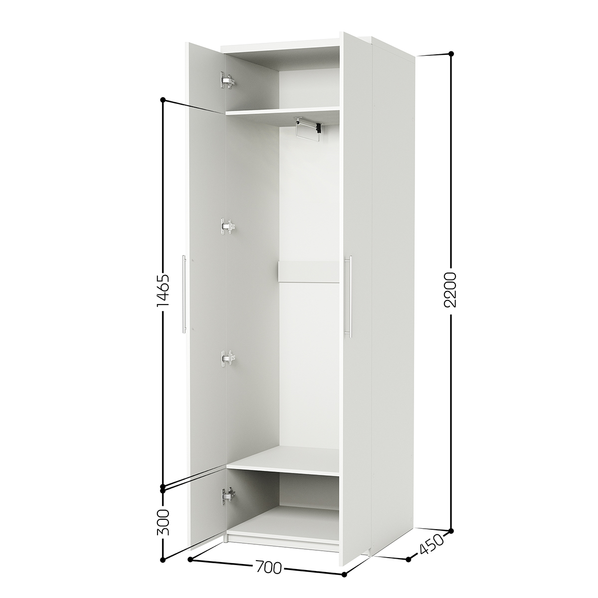 Габариты внешние: ширина 700 мм. глубина 450 мм. высота 2200 мм. Гарантия: 18 месяцев, Выдвижная штанга для вешалок: да, Страна производства: Россия, Материал корпуса: ЛДСП, Количество дверей: 2,Зеркало в дверце: нет, Тип шкафа: для одежды, Требуется сборка: да. Изделие выполнено из высококачественной ЛДСП отечественного производства. Края отделаны кромкой ПВХ 2 мм. Изделие поставляется в разобранном виде. В комплект входит инструкция. Корпус ламинированная ДСП, Задняя стенка ДВП, Тип шкафа линейный (прямой).