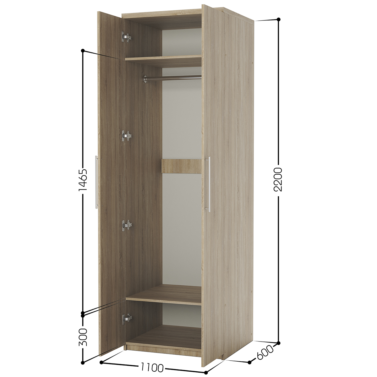 Габариты внешние: ширина 1100 мм. глубина 600 мм. высота 2200 мм. Гарантия: 18 месяцев, Штанга для вешалок: да, Страна производства: Россия, Материал корпуса: ЛДСП, Количество дверей: 2, Зеркало в дверце: нет, Тип шкафа: для одежды, Требуется сборка: да. Изделие выполнено из высококачественной ЛДСП отечественного производства. Края отделаны кромкой ПВХ 2 мм. Изделие поставляется в разобранном виде. В комплект входит инструкция. Корпус ламинированная ДСП, Задняя стенка ДВП, Тип шкафа линейный (прямой).