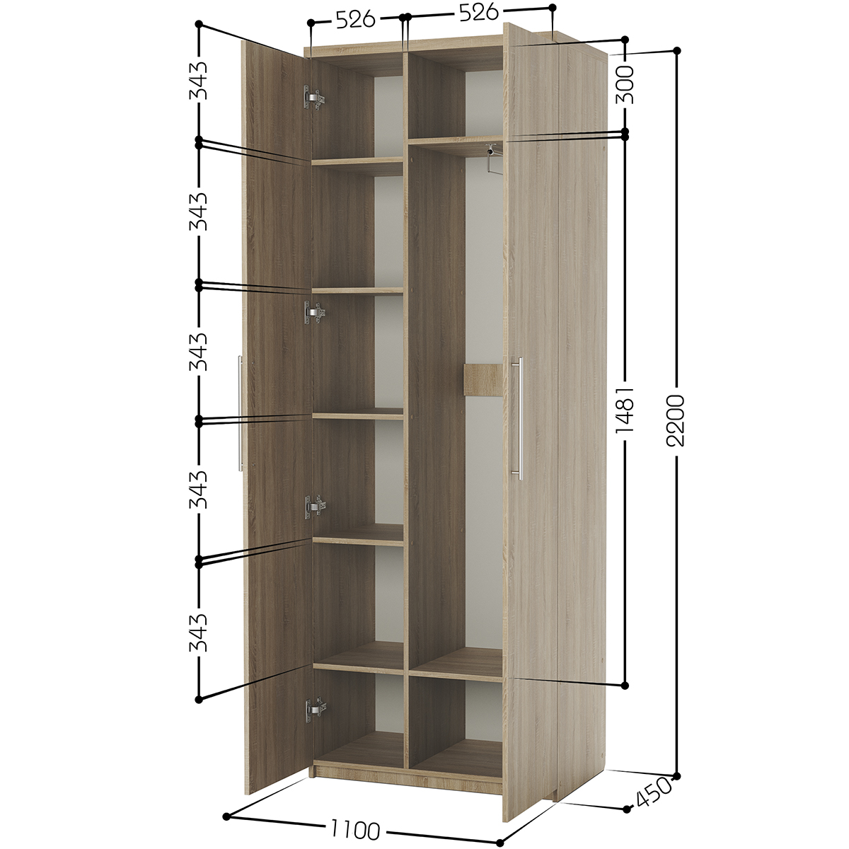 Габариты внешние: ширина 1100 мм. глубина 450 мм. высота 2200 мм., Гарантия: 18 месяцев, Выдвижная штанга для вешалок: да, Страна производства: Россия, Материал корпуса: ЛДСП, Количество дверей: 2,Зеркало в дверце: нет, Тип шкафа: для одежды, Требуется сборка: да Наполнение шкафа комбинированный полки и штанга. Изделие выполнено из высококачественной ЛДСП отечественного производства. Края отделаны кромкой ПВХ 2 мм. Изделие поставляется в разобранном виде. В комплект входит инструкция. Корпус ламинированная ДСП, Задняя стенка ДВП, Тип шкафа линейный (прямой).