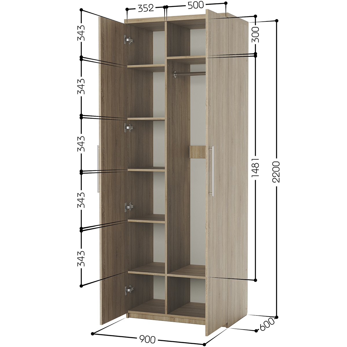 Габариты внешние: ширина 900 мм. глубина 600 мм. высота 2200 мм., Гарантия: 18 месяцев, Штанга для вешалок: да, Страна производства: Россия, Материал корпуса: ЛДСП, Количество дверей: 2,Зеркало в дверце: нет, Тип шкафа: для одежды, Требуется сборка: да Наполнение шкафа комбинированный полки и штанга. Изделие выполнено из высококачественной ЛДСП отечественного производства. Края отделаны кромкой ПВХ 2 мм. Изделие поставляется в разобранном виде. В комплект входит инструкция. Корпус ламинированная ДСП, Задняя стенка ДВП, Тип шкафа линейный (прямой).