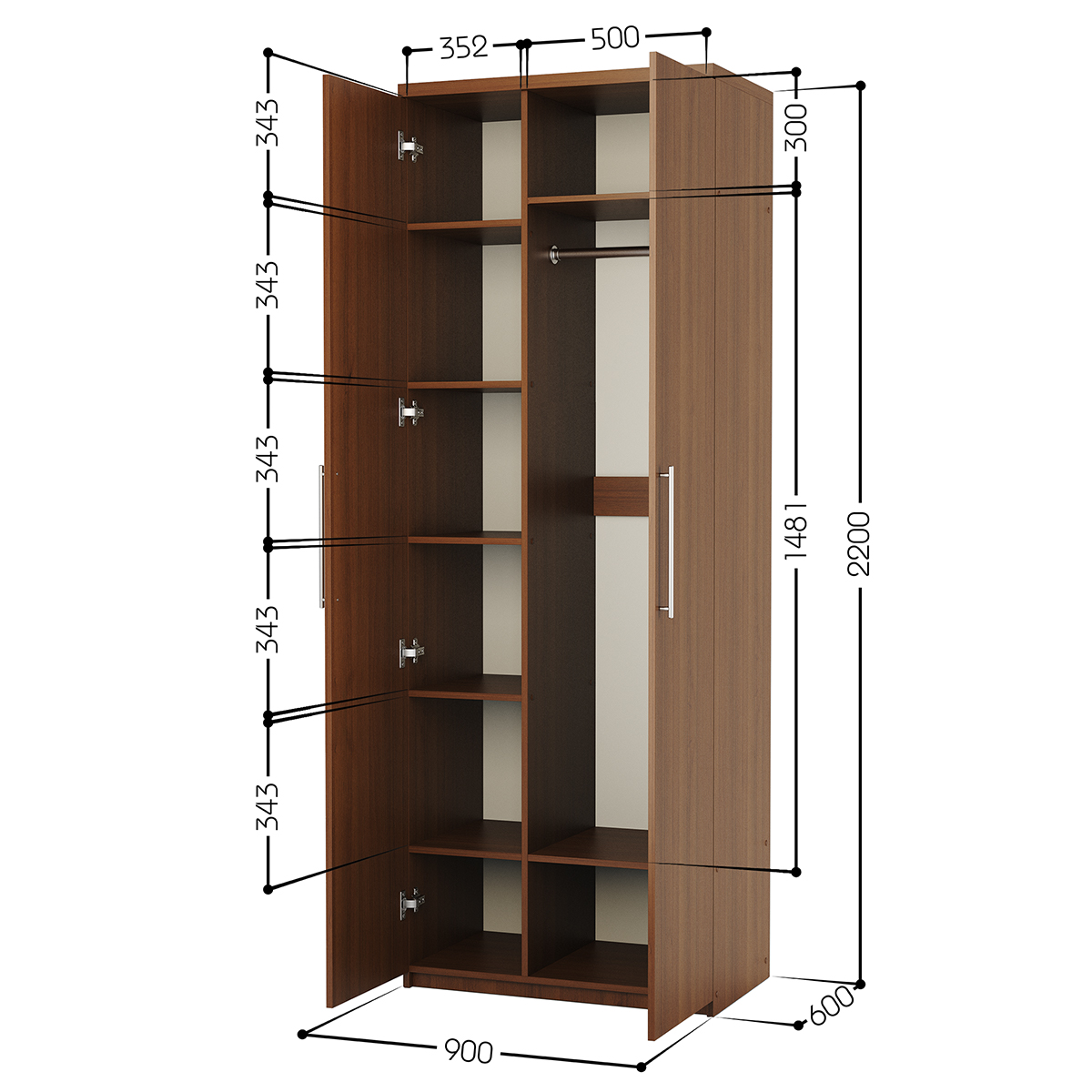 Габариты внешние: ширина 900 мм. глубина 600 мм. высота 2200 мм., Гарантия: 18 месяцев, Штанга для вешалок: да, Страна производства: Россия, Материал корпуса: ЛДСП, Количество дверей: 2,Зеркало в дверце: нет, Тип шкафа: для одежды, Требуется сборка: да Наполнение шкафа комбинированный полки и штанга. Изделие выполнено из высококачественной ЛДСП отечественного производства. Края отделаны кромкой ПВХ 2 мм. Изделие поставляется в разобранном виде. В комплект входит инструкция. Корпус ламинированная ДСП, Задняя стенка ДВП, Тип шкафа линейный (прямой).