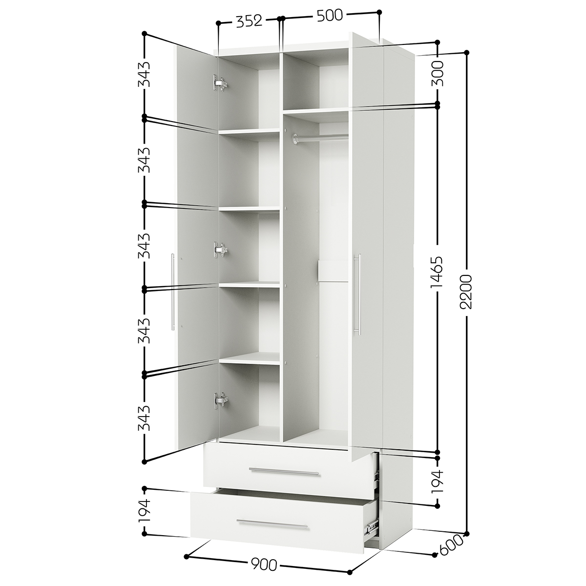 Габариты внешние: ширина 900 мм. глубина 600 мм. высота 2200 мм., Гарантия: 18 месяцев, Штанга для вешалок: да, Страна производства: Россия, Материал корпуса: ЛДСП, Количество дверей: 2,Зеркало в дверце: нет, Тип шкафа: для одежды, Требуется сборка: да Наполнение шкафа комбинированный полки и штанга. Изделие выполнено из высококачественной ЛДСП отечественного производства. Края отделаны кромкой ПВХ 2 мм. Изделие поставляется в разобранном виде. В комплект входит инструкция. Корпус ламинированная ДСП, Задняя стенка ДВП, Тип шкафа линейный (прямой).