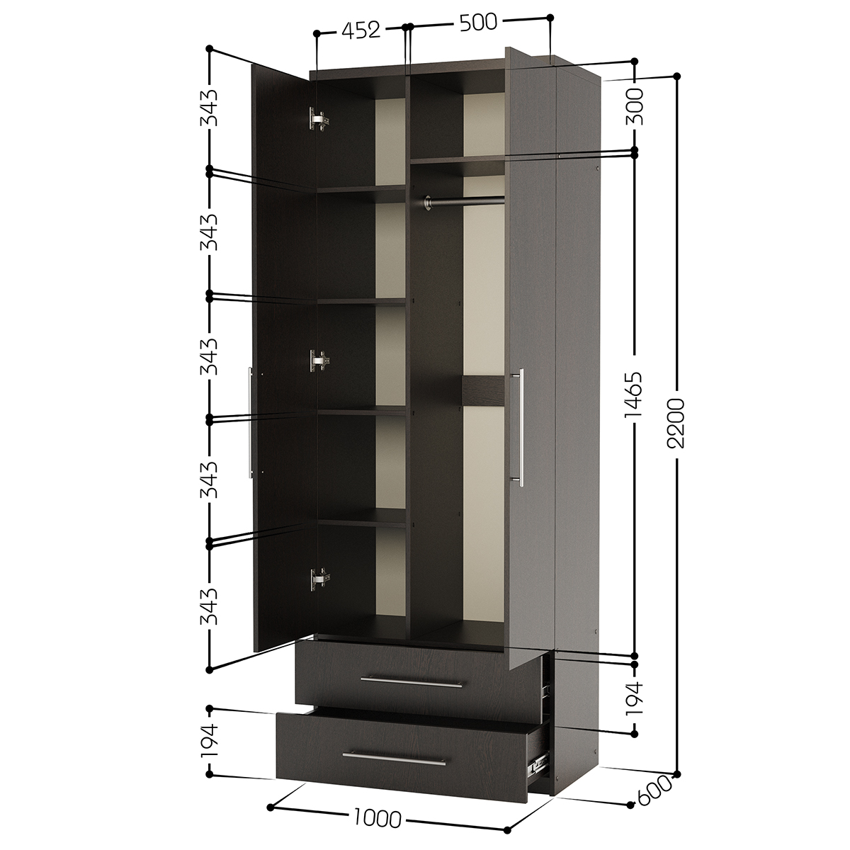 Габариты внешние: ширина 1000 мм. глубина 600 мм. высота 2200 мм., Гарантия: 18 месяцев, Штанга для вешалок: да, Страна производства: Россия, Материал корпуса: ЛДСП, Количество дверей: 2,Зеркало в дверце: нет, Тип шкафа: для одежды, Требуется сборка: да Наполнение шкафа комбинированный полки и штанга. Изделие выполнено из высококачественной ЛДСП отечественного производства. Края отделаны кромкой ПВХ 2 мм. Изделие поставляется в разобранном виде. В комплект входит инструкция. Корпус ламинированная ДСП, Задняя стенка ДВП, Тип шкафа линейный (прямой).
