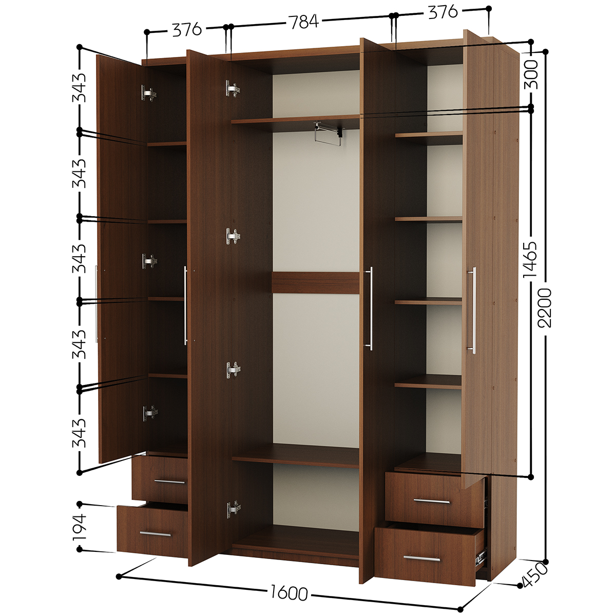 Габариты внешние: ширина 1600 мм. глубина 450 мм. высота 2200 мм., Гарантия: 18 месяцев, Выдвижная штанга для вешалок: да, Страна производства: Россия, Материал корпуса: ЛДСП, Количество дверей: 4,Зеркало в дверце: нет, Тип шкафа: для одежды, Требуется сборка: да Наполнение шкафа комбинированный полки и штанга. Изделие выполнено из высококачественной ЛДСП отечественного производства. Края отделаны кромкой ПВХ 2 мм. Изделие поставляется в разобранном виде. В комплект входит инструкция. Корпус ламинированная ДСП, Задняя стенка ДВП, Тип шкафа линейный (прямой).