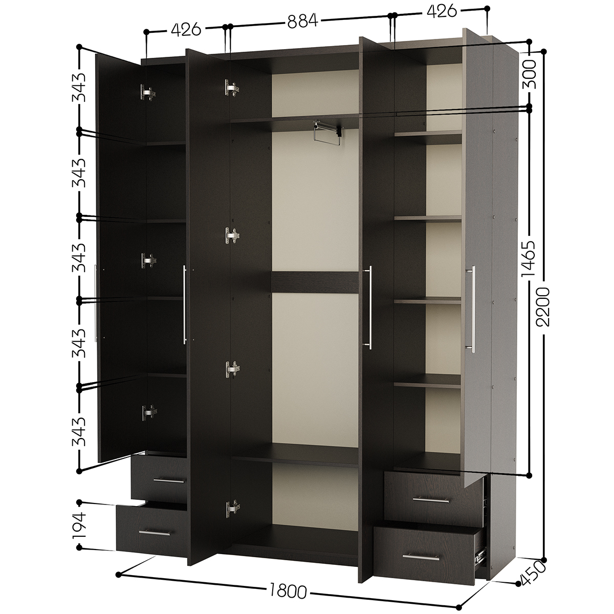Габариты внешние: ширина 1800 мм. глубина 450 мм. высота 2200 мм., Гарантия: 18 месяцев, Выдвижная штанга для вешалок: да, Страна производства: Россия, Материал корпуса: ЛДСП, Количество дверей: 4,Зеркало в дверце: нет, Тип шкафа: для одежды, Требуется сборка: да Наполнение шкафа комбинированный полки и штанга. Изделие выполнено из высококачественной ЛДСП отечественного производства. Края отделаны кромкой ПВХ 2 мм. Изделие поставляется в разобранном виде. В комплект входит инструкция. Корпус ламинированная ДСП, Задняя стенка ДВП, Тип шкафа линейный (прямой).