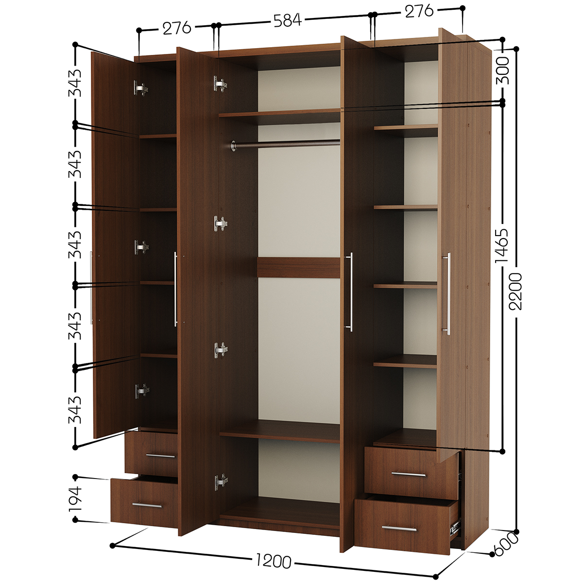 Габариты внешние: ширина 1200 мм. глубина 600 мм. высота 2200 мм., Гарантия: 18 месяцев, Штанга для вешалок: да, Страна производства: Россия, Материал корпуса: ЛДСП, Количество дверей: 4,Зеркало в дверце: нет, Тип шкафа: для одежды, Требуется сборка: да Наполнение шкафа комбинированный полки и штанга. Изделие выполнено из высококачественной ЛДСП отечественного производства. Края отделаны кромкой ПВХ 2 мм. Изделие поставляется в разобранном виде. В комплект входит инструкция. Корпус ламинированная ДСП, Задняя стенка ДВП, Тип шкафа линейный (прямой).