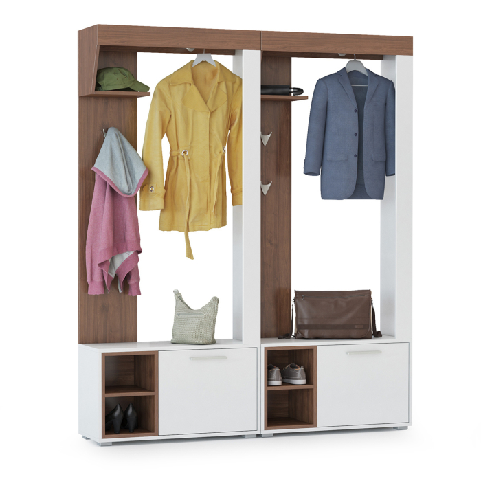 Прихожая Лайт комплектация № 5 - недорогая стильная и современная мебель для Вашего дома. Конструктивно прихожая Лайт № 5 состоит из двух комбинированных шкафов Лайт 10.03. Данная коллекция придётся по вкусу любителям дизайна с натуральными цветами, прямыми линиями и высокой функциональности. Искристо-белые фасады прихожей Лайт, оттеняются тёплым тоном корпуса мебели, окрашенном под древесину ореха. Ровные линии, прямые углы создают ощущение порядка, чистоты и гармонии. Шкаф комбинированный Лайт 10.03 (в комплекте 2 шт.) состоит из тумбы и П-образной стойки с крючками, штангой для одежды и открытой полочки для головных уборов или предметов декора. Тумба располагает закрытой распашной дверкой нишей и открытой нишей с полочкой внутри. При весьма компактных размерах (глубина модуля составляет всего 32 см.) шкаф порадует высокой функциональностью. Изготовлена мебель Лайт из материалов высокого качества под постоянным контролем качества. Корпус и фасады прихожей выполнены из ламинированной ДСП 16 мм., края закромлены плёнкой ПВХ. Распашные двери мебели закреплены на четырехшарнирных петлях, для открывания некоторых используется механизм Push. Стильные ручки и крючки открытой вешалки выполнены из прочного ABS-пластика цвета «сатин». Поставляется мебель Лайт в разобранном виде, надёжно упакованной, в комплекте с фурнитурой. К каждому модулю прилагается пакет документов, включающий гарантийный талон и инструкцию по сборке.