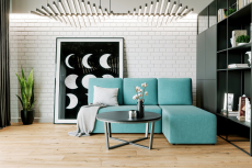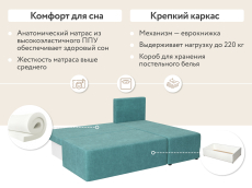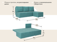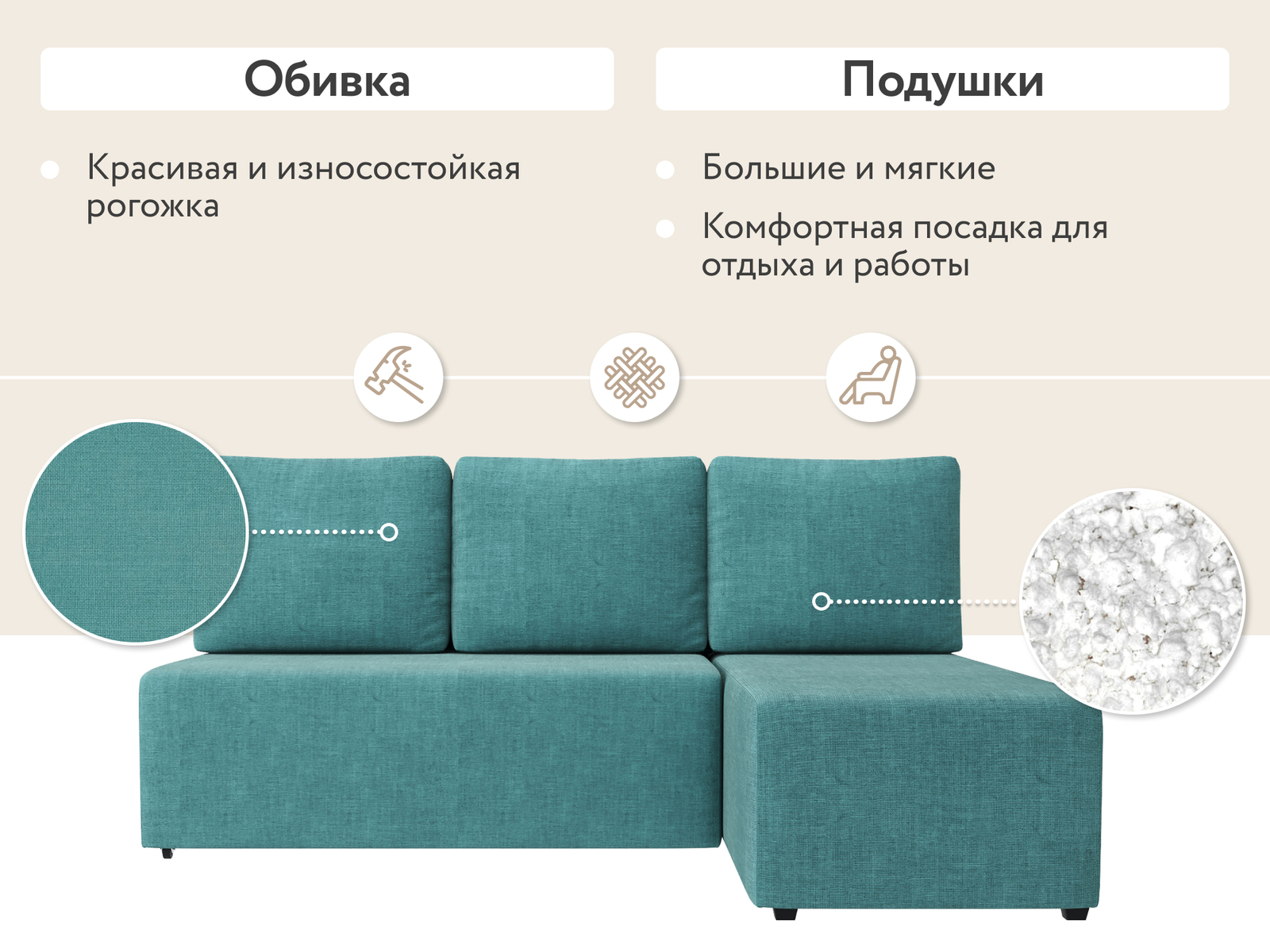 Компактный диван с универсальным углом гармонично впишется в любой современный или сдержанный классический интерьер. Эта модель представлена в практичной и износостойкой обивке из рогожки. Особенностью дивана является отсутствие подлокотников, что значительно увеличивает площадь посадочных мест, которых в данной модели предусмотрено три. Легкий в использовании механизм трансформации «Еврокнижка» превращает этот диван в полноценную полутороспальную кровать, в основе которой начинка из синтепона и ППУ. Для хранения спальных принадлежностей или других вещей можно использовать объемный бельевой короб.