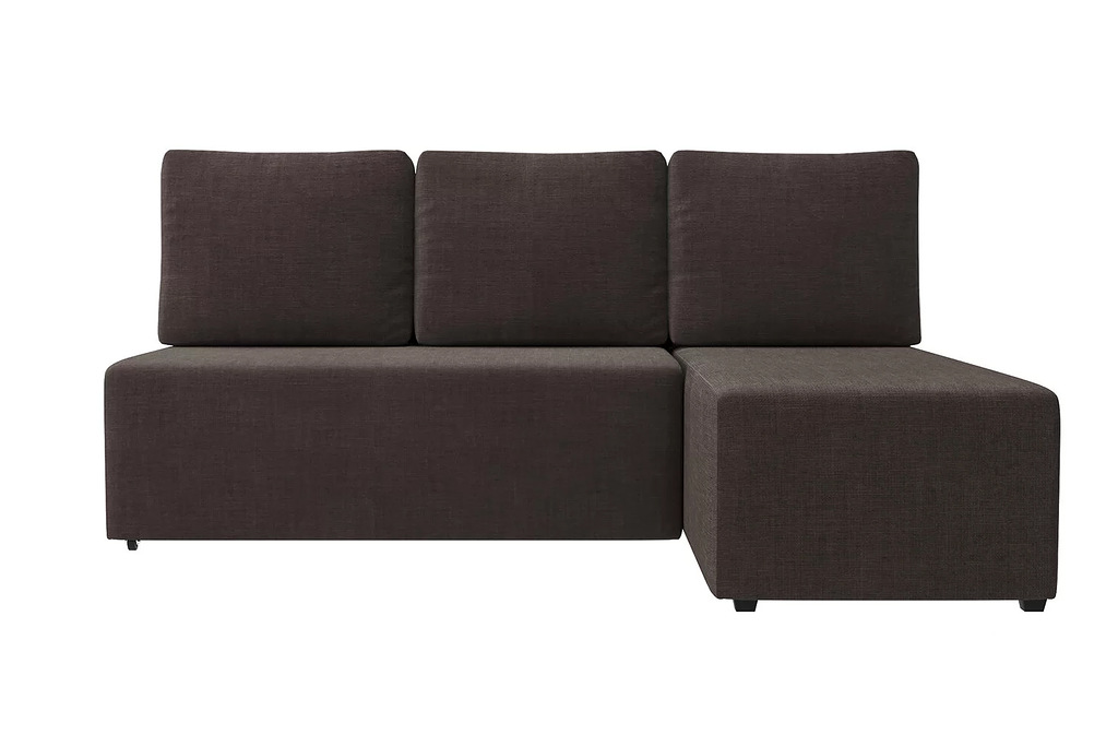 Компактный диван с универсальным углом гармонично впишется в любой современный или сдержанный классический интерьер. Эта модель представлена в практичной и износостойкой обивке из рогожки. Особенностью дивана является отсутствие подлокотников, что значительно увеличивает площадь посадочных мест, которых в данной модели предусмотрено три. Легкий в использовании механизм трансформации «Еврокнижка» превращает этот диван в полноценную полутороспальную кровать, в основе которой начинка из синтепона и ППУ. Для хранения спальных принадлежностей или других вещей можно использовать объемный бельевой короб.