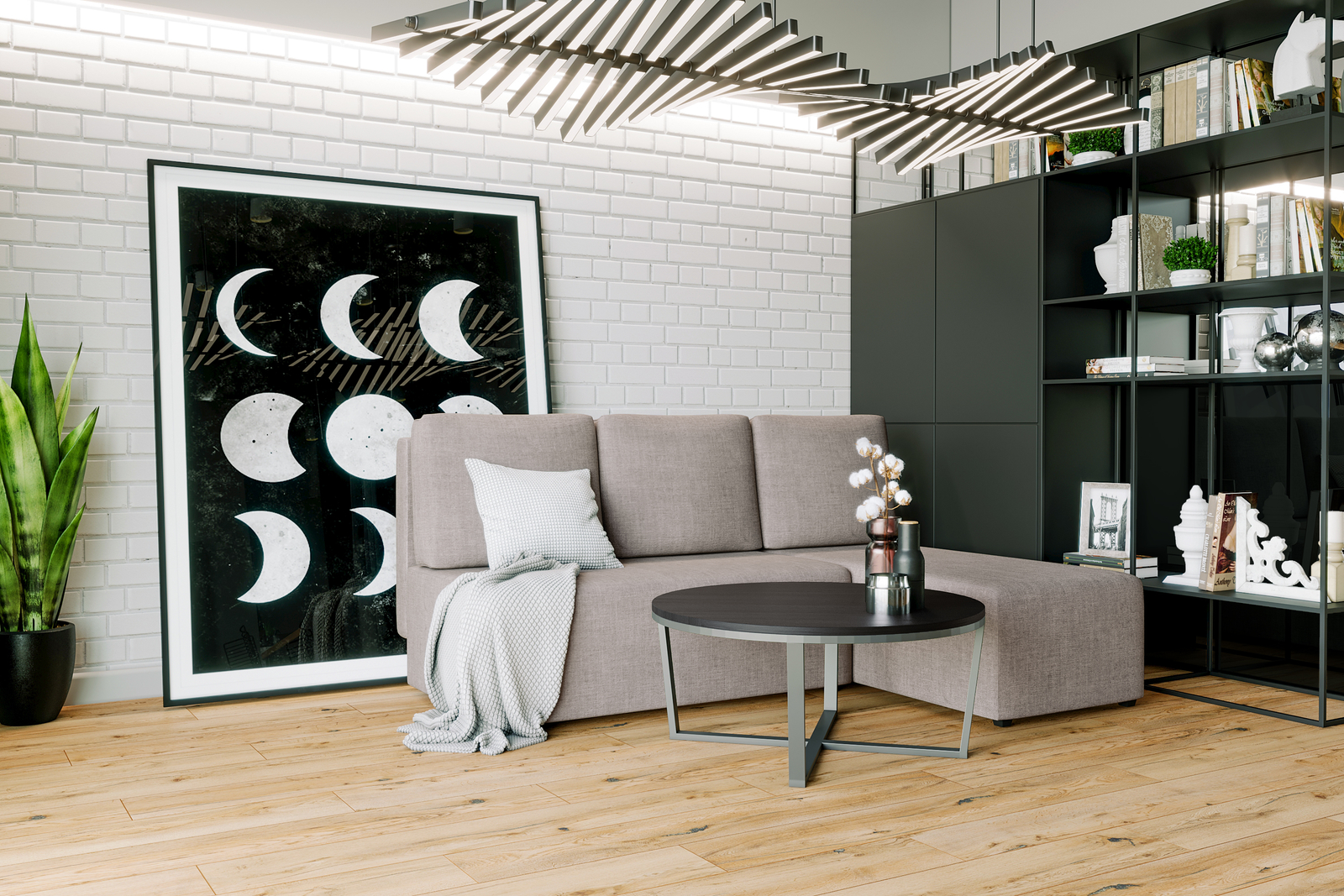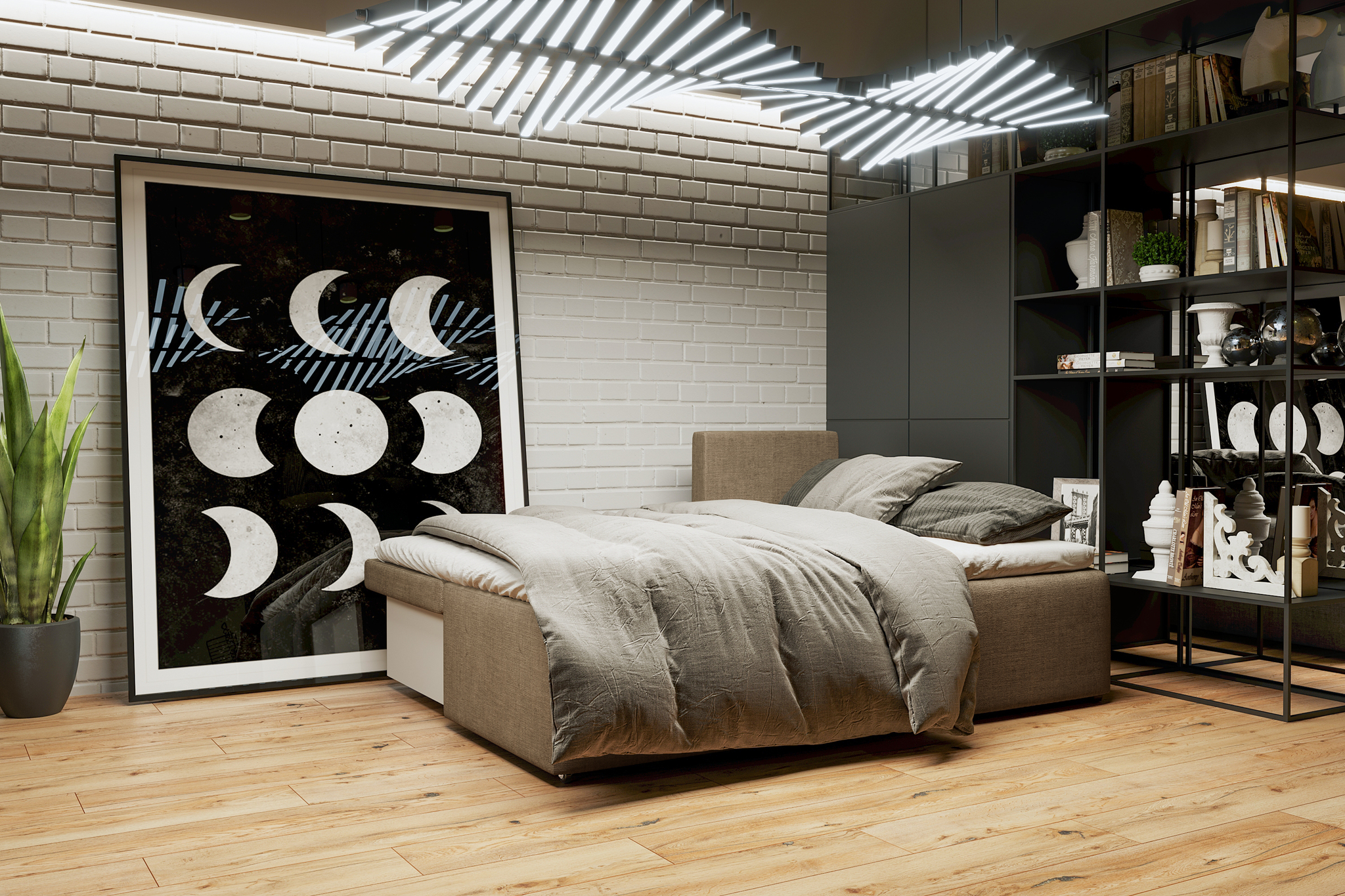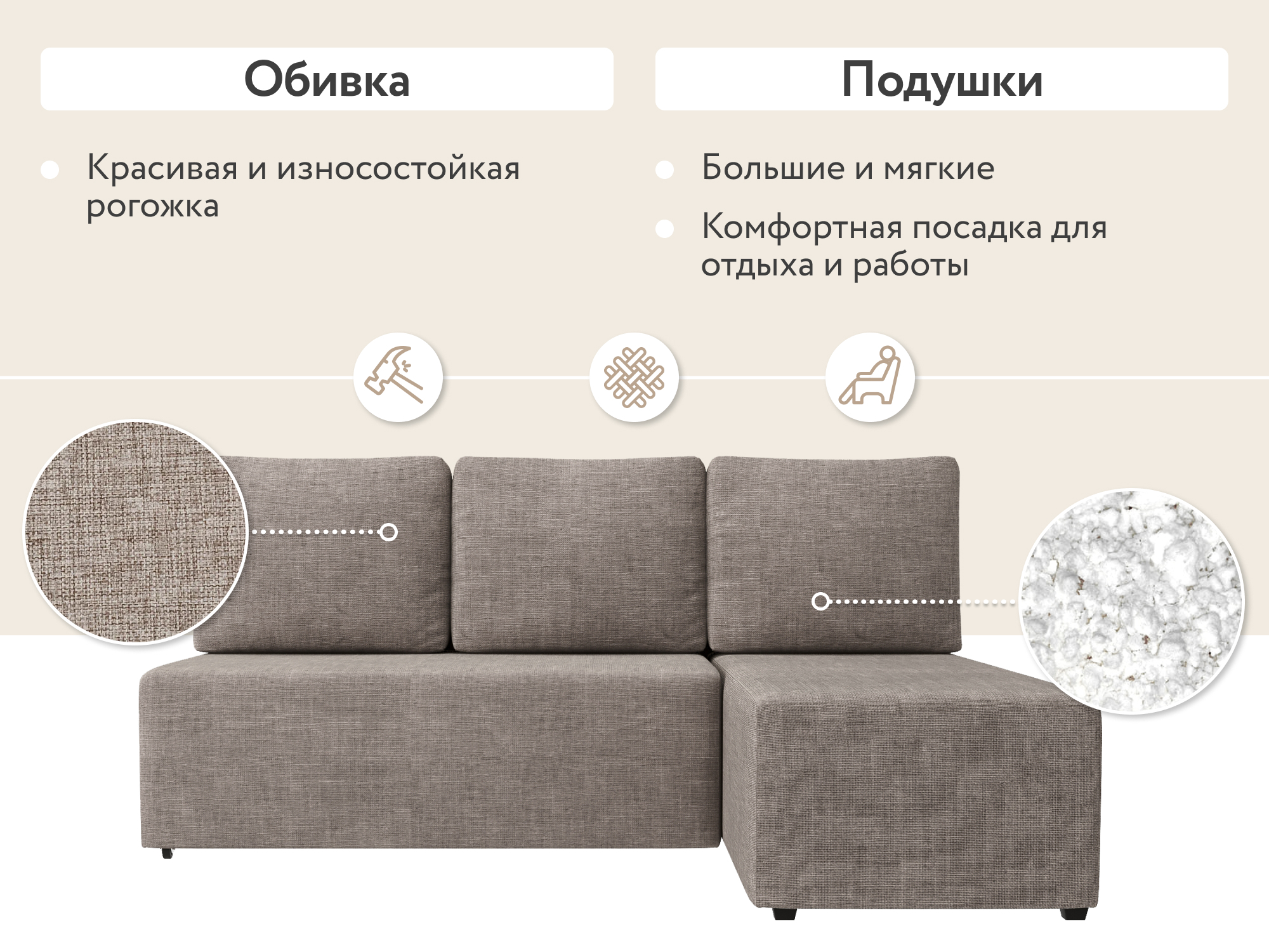 Компактный диван с универсальным углом гармонично впишется в любой современный или сдержанный классический интерьер. Эта модель представлена в практичной и износостойкой обивке из рогожки. Особенностью дивана является отсутствие подлокотников, что значительно увеличивает площадь посадочных мест, которых в данной модели предусмотрено три. Легкий в использовании механизм трансформации «Еврокнижка» превращает этот диван в полноценную полутороспальную кровать, в основе которой начинка из синтепона и ППУ. Для хранения спальных принадлежностей или других вещей можно использовать объемный бельевой короб.