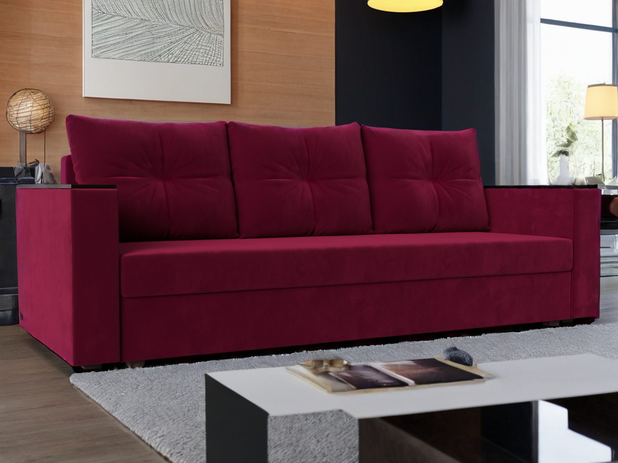 Прямой диван-кровать «Атланта» без стола — современная и функциональная модель станет уютным пространством для досуга. Три большие мягкие приспинные подушки обеспечат комфорт и удобство. Подлокотники с накладками могут выполнять функцию столика, на который всегда можно положить телефон и поставить чашечку чая. Механизм раскладки «еврокнижка» поможет превратить прямой диван в удобную кровать за считанные секунды. Нужно потянуть за нижнюю часть сиденья и опустить спинку в образовавшуюся нишу. Изделие дополнительно оборудовано вместительным ящиком для постельных принадлежностей. Крепкие пластиковые опоры отвечают за устойчивость дивана. За счет своей компактности он отлично впишется в обстановку детской комнаты или небольшой квартиры-студии.