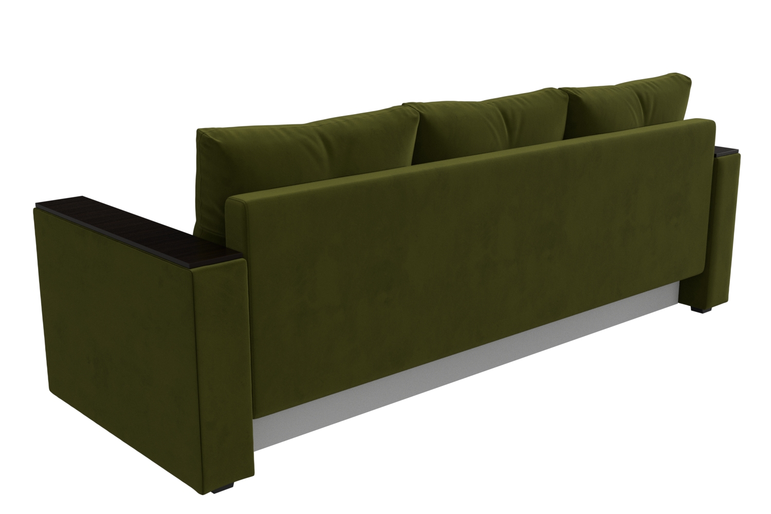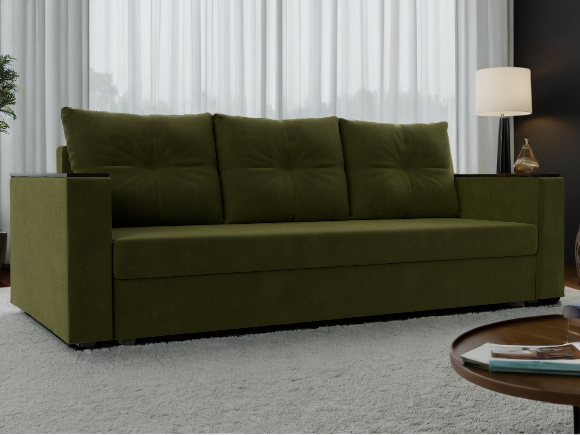 Прямой диван-кровать «Атланта» без стола — современная и функциональная модель станет уютным пространством для досуга. Три большие мягкие приспинные подушки обеспечат комфорт и удобство. Подлокотники с накладками могут выполнять функцию столика, на который всегда можно положить телефон и поставить чашечку чая. Механизм раскладки «еврокнижка» поможет превратить прямой диван в удобную кровать за считанные секунды. Нужно потянуть за нижнюю часть сиденья и опустить спинку в образовавшуюся нишу. Изделие дополнительно оборудовано вместительным ящиком для постельных принадлежностей. Крепкие пластиковые опоры отвечают за устойчивость дивана. За счет своей компактности он отлично впишется в обстановку детской комнаты или небольшой квартиры-студии.