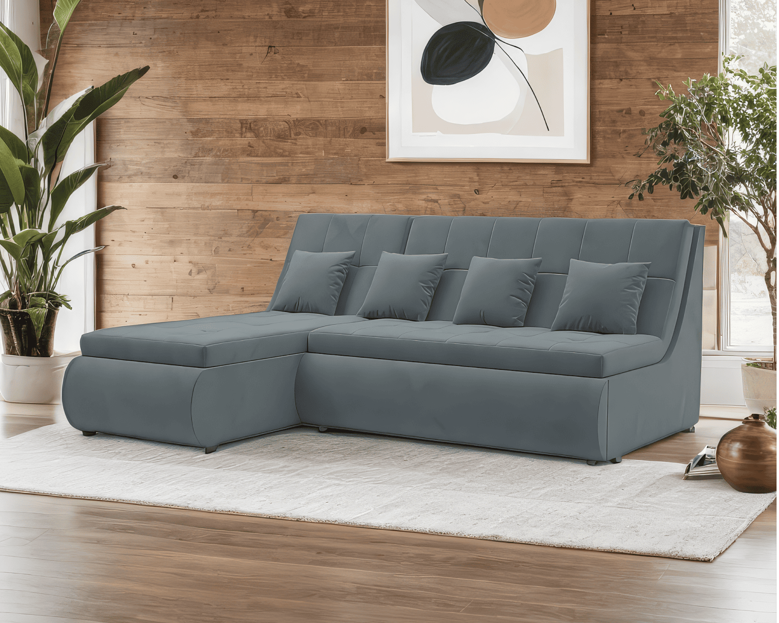 Диван угловой «Дубай» - создан с учетом вашего комфорта и спокойствия. Его конструкция имеет бесшовный угол между спинкой и сиденьем, что обеспечивает максимальный комфорт при отдыхе. Также в комплект входят четыре декоративные подушки, которые помогут вам расположиться на диване для отдыха или работы.