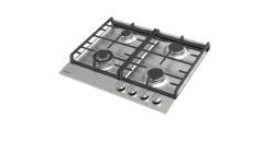 Варочная панель газовая, 60 см, 4 конфорки: экономичная конфорка (0,9 кВт), 2 стандартных конфорки (2х1,7 кВт), ВОК конфорка (2,5 кВт), газ-контроль, электроподжиг, нержавеющая сталь, чугунные решетки, поворотные переключатели, комплект форсунок-переходников на балонный газ.