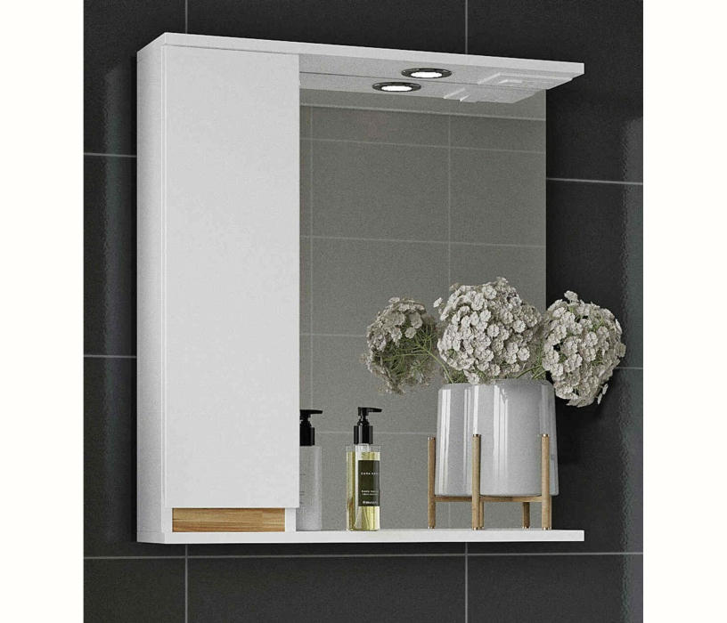 Смотрится отлично! Купили в ванную комнату, нас предупреждали, что материал не для размещения около мокрой зоны( висит очень близко к ванной) места мало даже для зеркала в 60 см шириной, но нам так подошло по дизайну, что решили однозначно берем! Не пожалели еще не разу- служит, убираю обычными средствами, шкаф удобный, и подсветка для лучшей видимости.