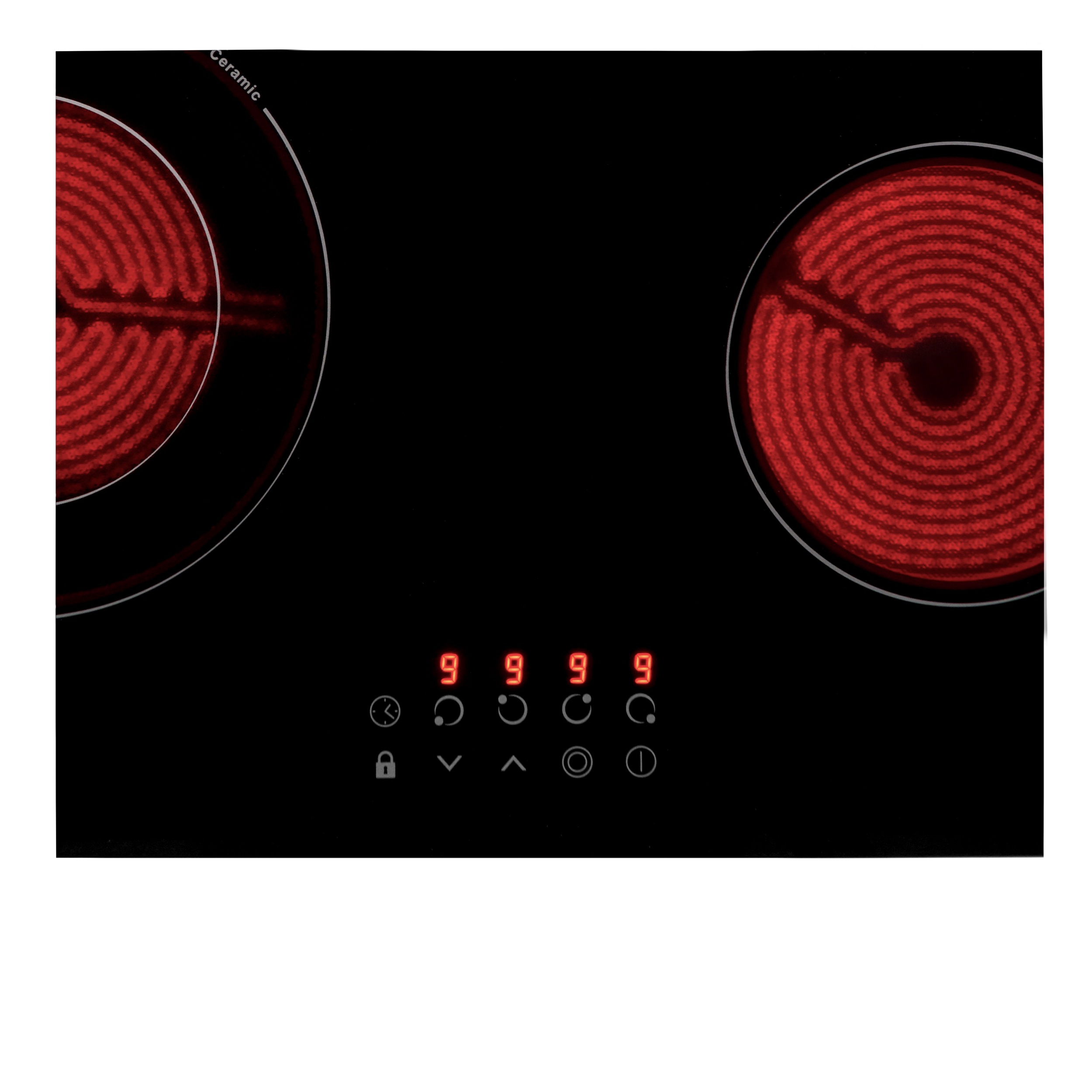 Варочная панель электрическая, стеклокерамика, Hi Light, 60 см, 4 конфорки, сенсорное управление, 9 уровней мощности, таймер 1-99 мин, блокировка управления, защитное отключение, двухконтурная, 6400 Вт, черное стекло, 590х520х50 мм.