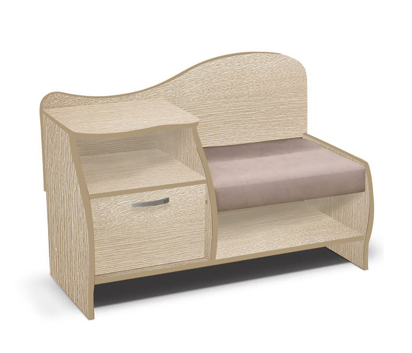 Тумба для обуви комплектуется открытой и закрытой полкой с дверцей и местом для сидения со спинкой.