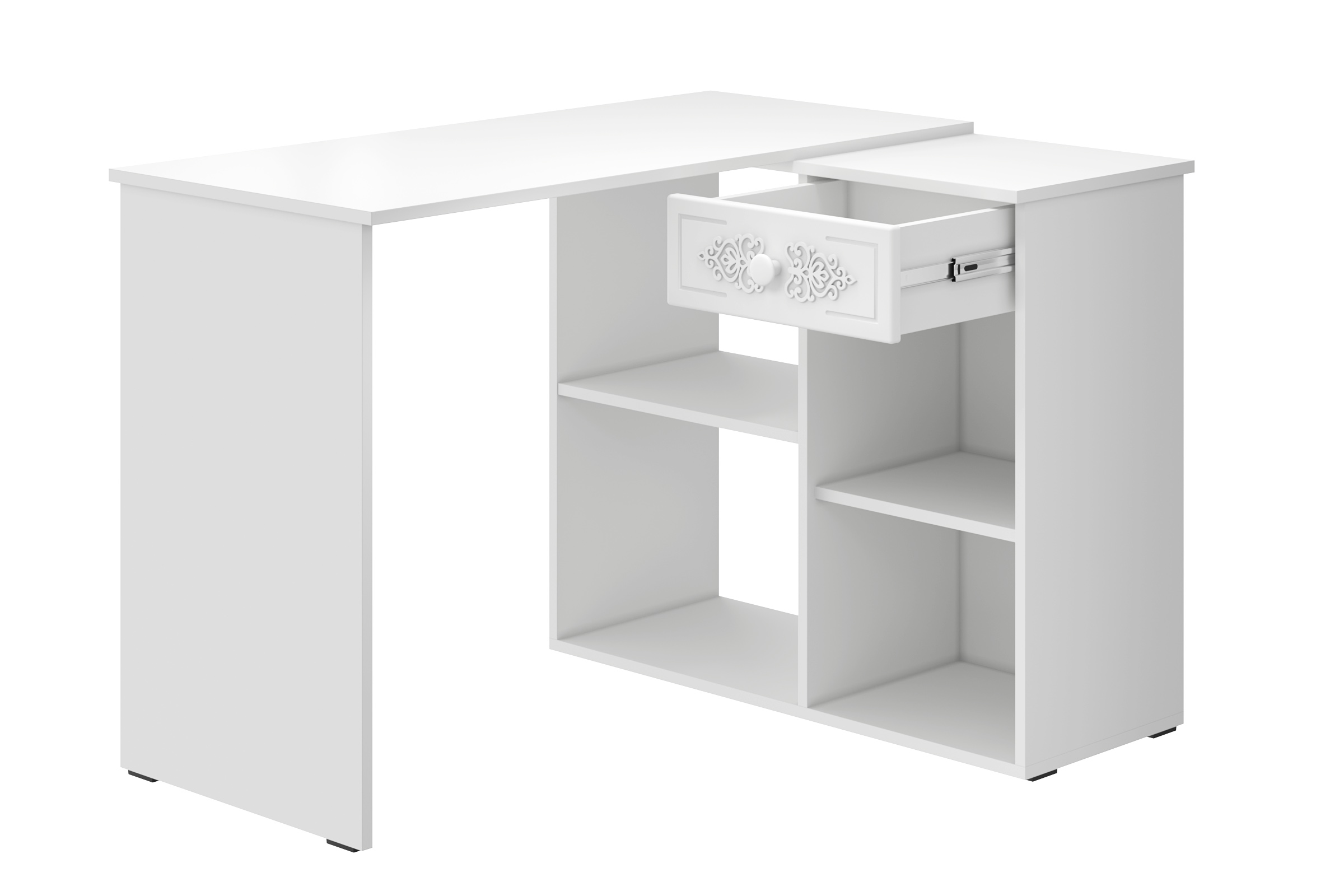 Угловой стол Ассоль АС-67 станет отличным местом для работы. В выдвижном ящике можно хранить блокнот, канцелярские принадлежности. Стильный дизайн позволит разместить в любом современной интерьере. Модуль может быть собран в зеркальном варианте "правым" или "левым". Фурнитура: телескопические направляющие полного выдвижения, петли с доводчиками.