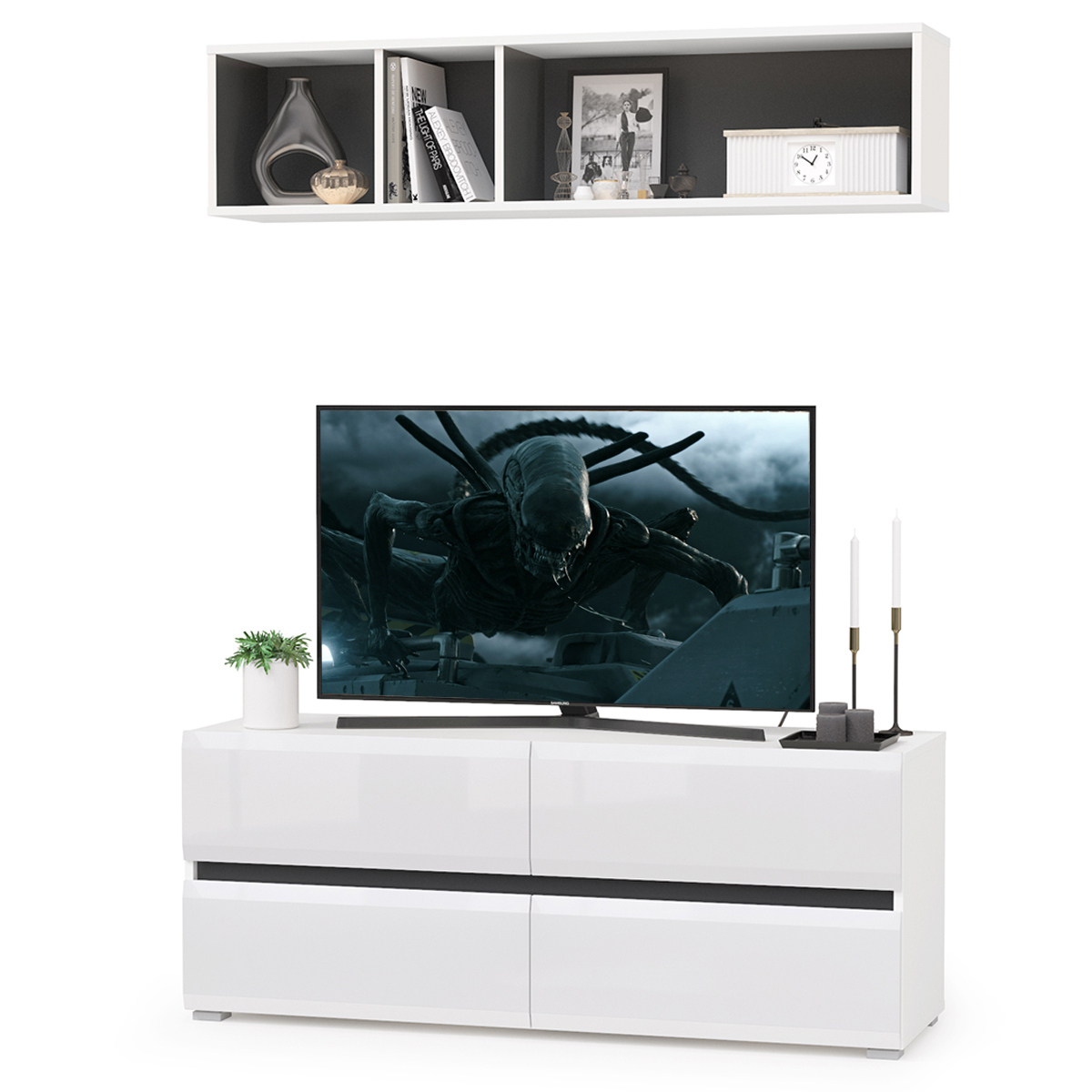 Лаконичные белые глянцевые фасады из МДФ 16 мм создают ощущение чистоты и свежести, лёгкости, свободного пространства. Акцентом выступают чёрные горизонтальные вставки между фасадами. Тумба оборудована четырьмя выдвижными ящиками на шариковых направляющих, что обеспечивает легкое открывание. Полка представляет из себя широкую нишу, разделенную на 3 ассиметричных отделения. Задняя стенка чёрного цвета эффектно подчеркивает наполнение полки. Имеет универсальную сборку - разделители внутри полки можно установить как слева, так и справа. Мебель выполнена из прочной ламинированной ДСП 16 мм, торцы деталей закромлены плёнкой ПВХ 0,4-2 мм. Фасады выполнены из МДФ 16 мм белый глянец. Поставляется набор в разобранном виде, надёжно упакованной в гофрокартон, с приложенной подробной инструкцией по сборке. Вы можете купить ТВ тумбу Сидней с полкой со скидкой при заказе через сайт в нашем магазине. Изображения ТВ тумбы Сидней с полкой Вы можете найти выше в начале страницы. Коллекция Сидней - современный дизайн, технологичность и надежность.
