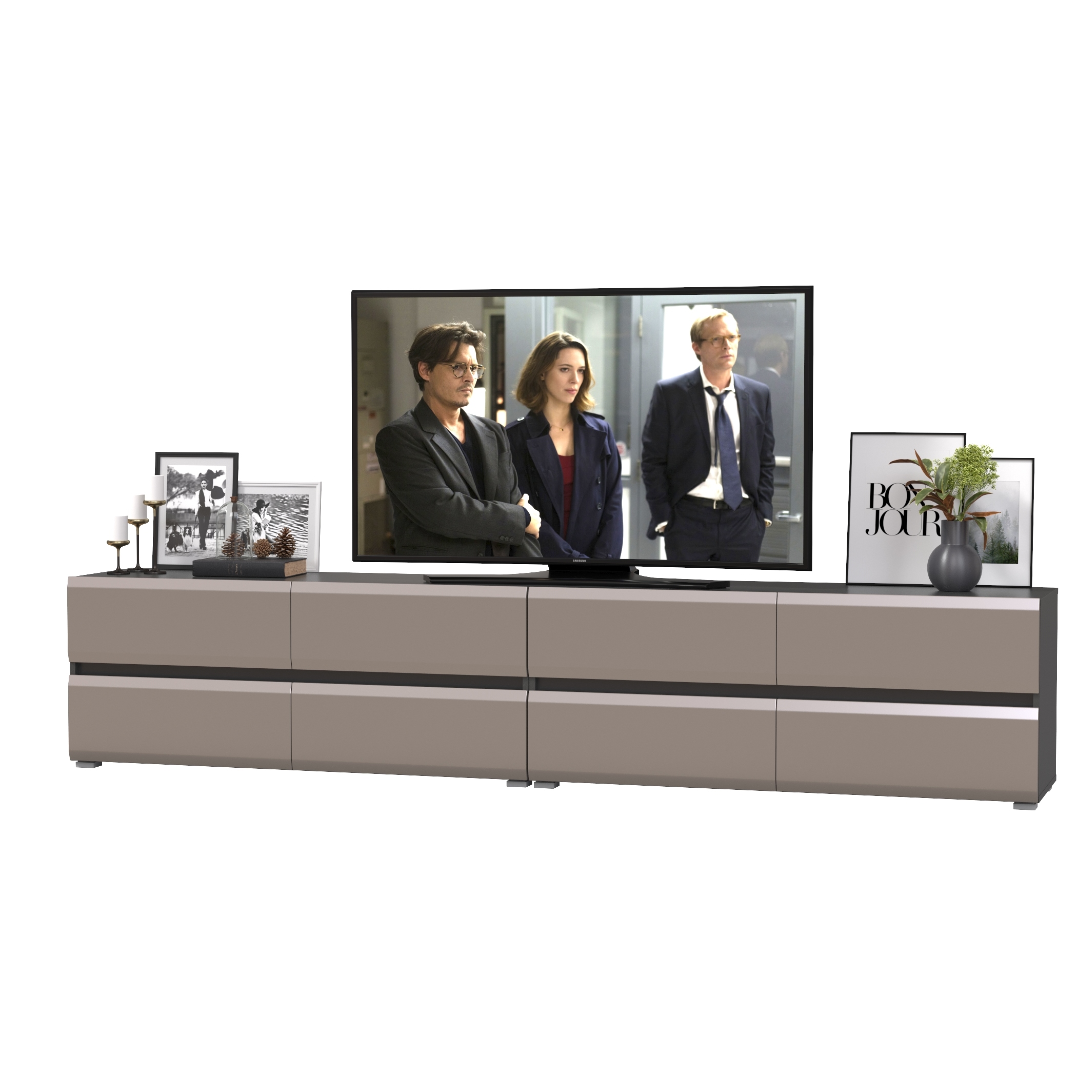 Тумба под ТВ состоит из двух тумб Сидней 13.63 объединенных в единый блок. Оснащена 8 выдвижными ящиками на шариковых направляющих, что обеспечивает легкое открывание. Фасады открываются за край, позволяя отказаться от использования ручек.