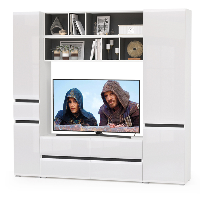 Сидней № 41 состоит из тумбы для ТВ, двух навесных полок и двух шкафов с дверками и ящиком. Тумба под ТВ Сидней 13.63 оборудована четырьмя выдвижными ящиками на шариковых направляющих, что обеспечивает легкое открывание. Шкаф Сидней 13.200 конструктивно разделён на два отделения за распашными дверками - верхнее и нижнее. За распашной дверкой верхнего отделения располагаются три полки, за дверкой нижнего - одна. Шкаф Сидней 13.202 состоит из верхнего и нижнего отделений с полками за дверками и выдвижным ящиком по центру. В верхнем отделении три полки, в нижнем 1 полочка. Сторону открывания дверей обоих шкафов, Вы определяете при сборке. Навесная полка Сидней 15.57, в комплектации 2 единицы, представляет из себя широкую нишу, разделенную на 3 ассиметричных отделения. Задняя стенка полки чёрного цвета эффектно подчеркивает наполнение полки. Полка имеет универсальную сборку - разделители внутри полки можно установить как слева, так и справа. Лаконичные белые глянцевые фасады из МДФ 16 мм создают ощущение чистоты и свежести, лёгкости, свободного пространства. Акцентом выступают чёрные горизонтальные вставки между фасадами. Фасады могут открываться за край, либо нажатием, с помощью механизма Push-to-Open, позволяющий отказаться от использования ручек. Распашные фасады оснащены доводчиками, что обеспечивает плавное закрывание и исключает удар о корпус. Мебель выполнена из прочной ламинированной ДСП 16 мм, торцы деталей закромлены плёнкой ПВХ 0,4-2 мм. Фасады выполнены из МДФ 16 мм белый глянец и тонированного стекла. Поставляется Сидней № 41 в разобранном виде, надёжно упакованной в гофрокартон, с приложенной подробной инструкцией по сборке. Вы можете купить Сидней № 41 со скидкой при заказе через сайт в нашем магазине. Изображения Сидней № 41 Вы можете найти выше в начале страницы. Коллекция Сидней - современный дизайн, технологичность и надежность.