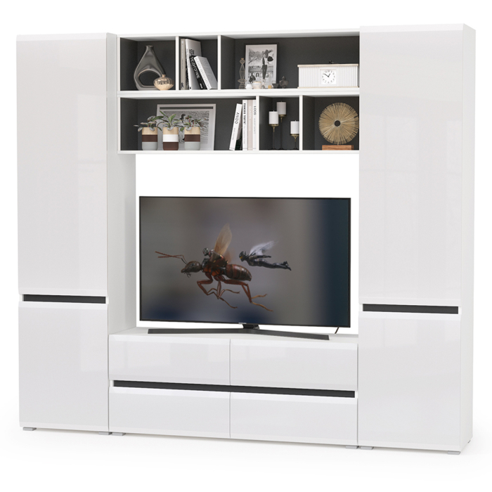 Сидней гостиная № 37 состоит из тумбы для ТВ, двух навесных полок и двух шкафов с глухими фасадами. Тумба под ТВ Сидней 13.63 оборудована четырьмя выдвижными ящиками на шариковых направляющих, что обеспечивает легкое открывание. Шкаф Сидней 13.200, в комплектации 2 единицы, конструктивно разделён на два отделения за распашными дверками - верхнее и нижнее. За распашной дверкой верхнего отделения располагаются три полки, за дверкой нижнего - одна. Сторону открывания дверей обоих шкафов, Вы определяете при сборке. Навесная полка Сидней 15.57, в комплектации 2 единицы, представляет из себя широкую нишу, разделенную на 3 ассиметричных отделения. Задняя стенка полки чёрного цвета эффектно подчеркивает наполнение полки. Полка имеет универсальную сборку - разделители внутри полки можно установить как слева, так и справа. Лаконичные белые глянцевые фасады из МДФ 16 мм создают ощущение чистоты и свежести, лёгкости, свободного пространства. Акцентом выступают чёрные горизонтальные вставки между фасадами. Фасады могут открываться за край, либо нажатием, с помощью механизма Push-to-Open, позволяющий отказаться от использования ручек. Распашные фасады оснащены доводчиками, что обеспечивает плавное закрывание и исключает удар о корпус. Мебель выполнена из прочной ламинированной ДСП 16 мм, торцы деталей закромлены плёнкой ПВХ 0,4-2 мм. Фасады выполнены из МДФ 16 мм белый глянец и тонированного стекла. Изображения гостиной Сидней № 37 Вы можете найти выше в начале страницы. Коллекция Сидней - современный дизайн, технологичность и надежность.