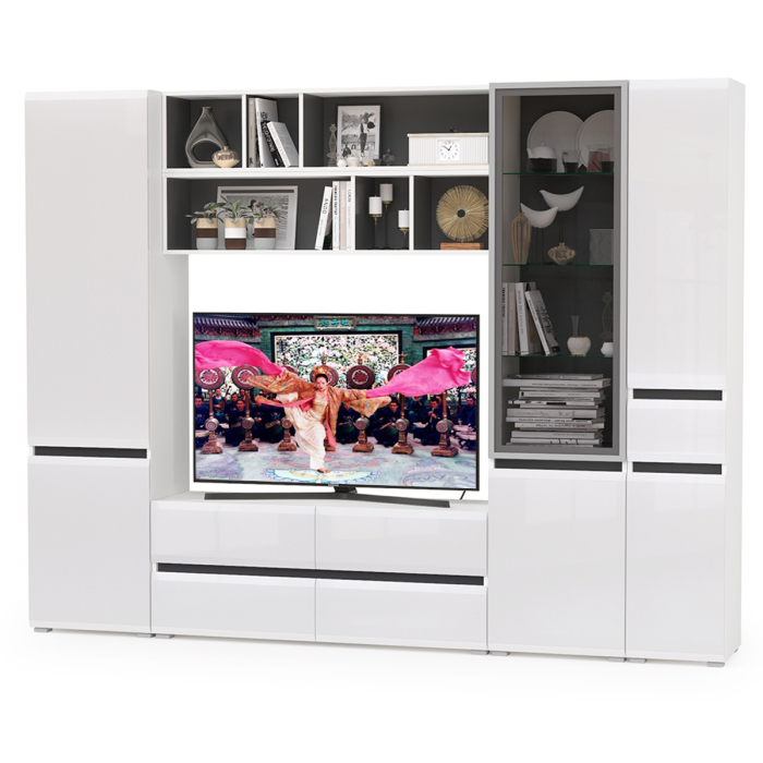 Широкая стенка в гостиную Сидней № 31 из тумбы для ТВ, двух навесных полок, шкафа-витрины, шкафа с глухими фасадами и шкафа с дверками и ящиком. Тумба под ТВ Сидней 13.63 оборудована четырьмя выдвижными ящиками на шариковых направляющих, что обеспечивает легкое открывание. Шкаф Сидней 13.200 конструктивно разделён на два отделения за распашными дверками - верхнее и нижнее. За распашной дверкой верхнего отделения располагаются три полки, за дверкой нижнего - одна. Шкаф Сидней 13.202 состоит из верхнего и нижнего отделений с полками за дверками и выдвижным ящиком по центру. В верхнем отделении три полки, в нижнем 1 полочка. Шкаф-витрина Сидней 13.201 конструктивно разделён на два отделения за распашными дверками - верхнее и нижнее. Верхнее отделение со стеклянной дверкой, за которой располагаются три стеклянные полки. За глухой дверкой нижнего отделения имеется одна полочка. Сторону открывания дверей обоих шкафов, Вы определяете при сборке. Навесная полка Сидней 15.57, в комплектации 2 единицы, представляет из себя широкую нишу, разделенную на 3 ассиметричных отделения. Задняя стенка полки чёрного цвета эффектно подчеркивает наполнение полки. Полка имеет универсальную сборку - разделители внутри полки можно установить как слева, так и справа. Лаконичные белые глянцевые фасады из МДФ 16 мм создают ощущение чистоты и свежести, лёгкости, свободного пространства. Акцентом выступают чёрные горизонтальные вставки между фасадами. Фасады могут открываться за край, либо нажатием, с помощью механизма Push-to-Open, позволяющий отказаться от использования ручек. Распашные фасады оснащены доводчиками, что обеспечивает плавное закрывание и исключает удар о корпус. Мебель выполнена из прочной ламинированной ДСП 16 мм, торцы деталей закромлены плёнкой ПВХ 0,4-2 мм. Фасады выполнены из МДФ 16 мм белый глянец и тонированного стекла. Поставляется широкая стенка в гостиную Сидней № 31 в разобранном виде, надёжно упакованной в гофрокартон, с приложенной подробной инструкцией по сборке. Вы можете купить широкую стенку в гостиную Сидней № 31 со скидкой при заказе через сайт в нашем магазине. Изображения широкой стенки в гостиную Сидней № 31 Вы можете найти выше в начале страницы. Коллекция Сидней - современный дизайн, технологичность и надежность.