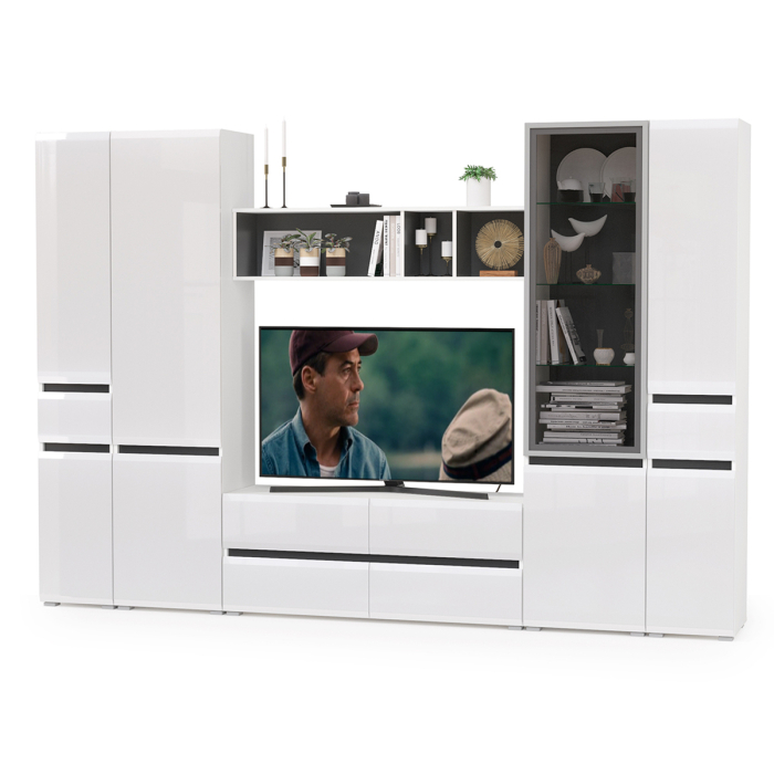 Большая стенка для гостиной Сидней № 30 состоит из шкафа-витрины и шкафа с ящиком, тумбы для ТВ, навесной полки и двух шкафов с глухими фасадами и с ящиком. Тумба под ТВ Сидней 13.63 оборудована четырьмя выдвижными ящиками на шариковых направляющих, что обеспечивает легкое открывание. Шкаф Сидней 13.200 конструктивно разделён на два отделения за распашными дверками - верхнее и нижнее. За распашной дверкой верхнего отделения располагаются три полки, за дверкой нижнего - одна. Шкаф Сидней 13.202, в комплектации 2 единицы, состоит из верхнего и нижнего отделений с полками за дверками и выдвижным ящиком по центру. В верхнем отделении три полки, в нижнем 1 полочка. Шкаф-витрина Сидней 13.201 конструктивно разделён на два отделения за распашными дверками - верхнее и нижнее. Верхнее отделение со стеклянной дверкой, за которой располагаются три стеклянные полки. За глухой дверкой нижнего отделения имеется одна полочка. Сторону открывания дверей обоих шкафов, Вы определяете при сборке. Навесная полка Сидней 15.57 представляет из себя широкую нишу, разделенную на 3 ассиметричных отделения. Задняя стенка полки чёрного цвета эффектно подчеркивает наполнение полки. Полка имеет универсальную сборку - разделители внутри полки можно установить как слева, так и справа. Лаконичные белые глянцевые фасады из МДФ 16 мм создают ощущение чистоты и свежести, лёгкости, свободного пространства. Акцентом выступают чёрные горизонтальные вставки между фасадами. Фасады могут открываться за край, либо нажатием, с помощью механизма Push-to-Open, позволяющий отказаться от использования ручек. Распашные фасады оснащены доводчиками, что обеспечивает плавное закрывание и исключает удар о корпус. Мебель выполнена из прочной ламинированной ДСП 16 мм, торцы деталей закромлены плёнкой ПВХ 0,4-2 мм. Фасады выполнены из МДФ 16 мм белый глянец и тонированного стекла. Изображения большой стенки для гостиной Сидней № 30 Вы можете найти выше в начале страницы. Коллекция Сидней - современный дизайн, технологичноть и надежность.