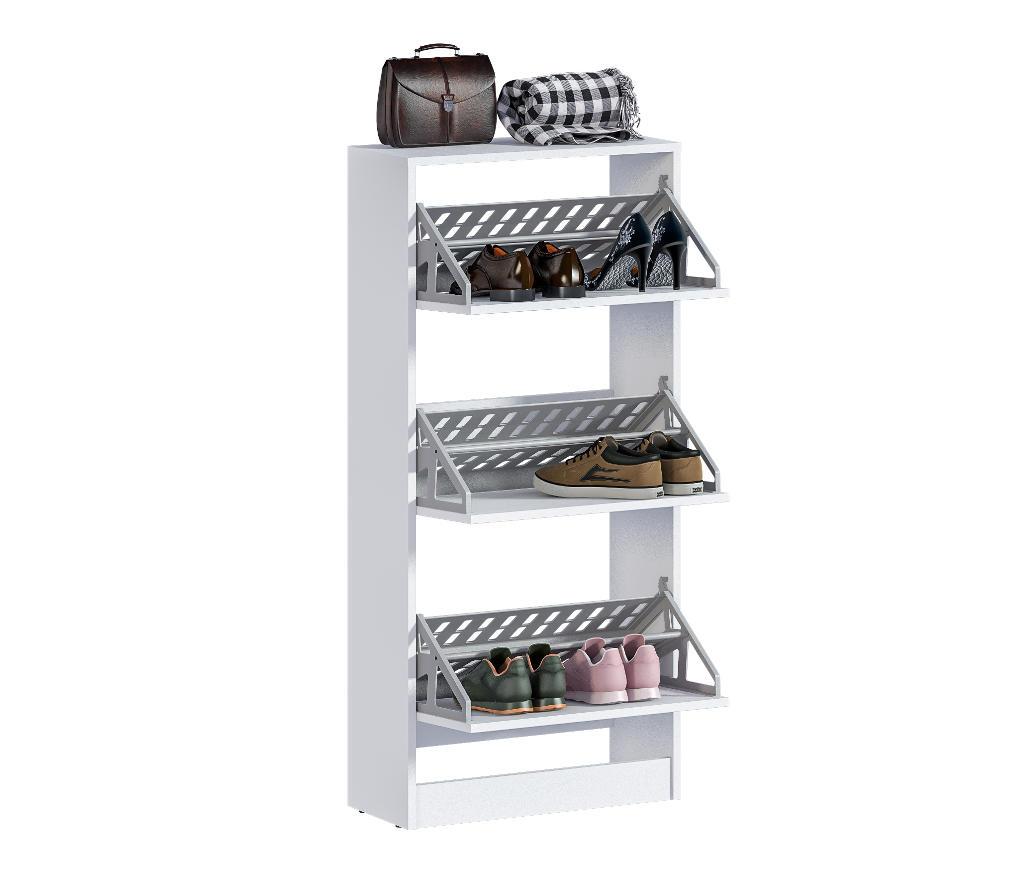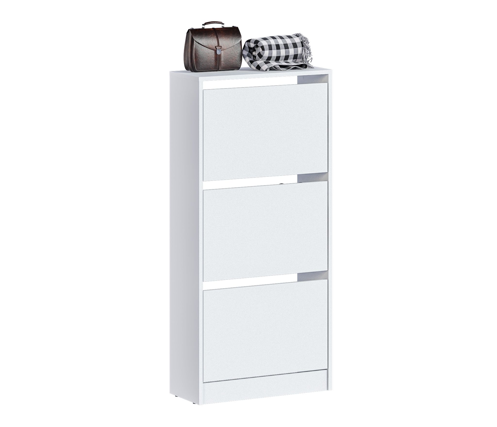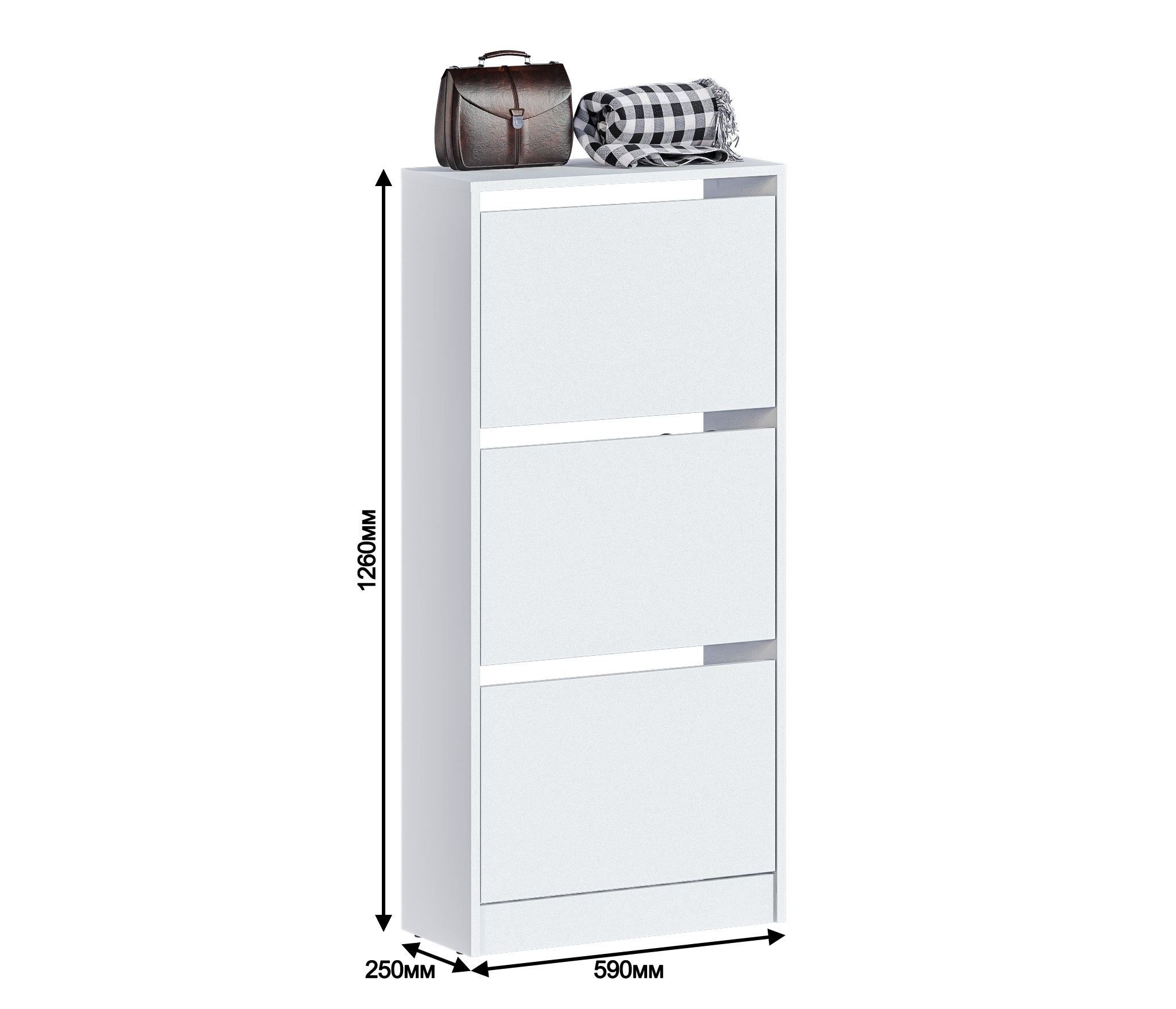 Габаритные размеры – ширина 59 см, высота 126 см и глубина 25 см. Обувница имеет три отделения, каждое из которых оснащено специальными стойками для хранения обуви. Отсутствие ручек и строгие геометрические формы позволяют вписать обувницу в любой интерьер. Обувница произведена из экологичного прочного КДСП, устойчивого к мелким механическим повреждениям. Отделка выполнена в белом цвете.