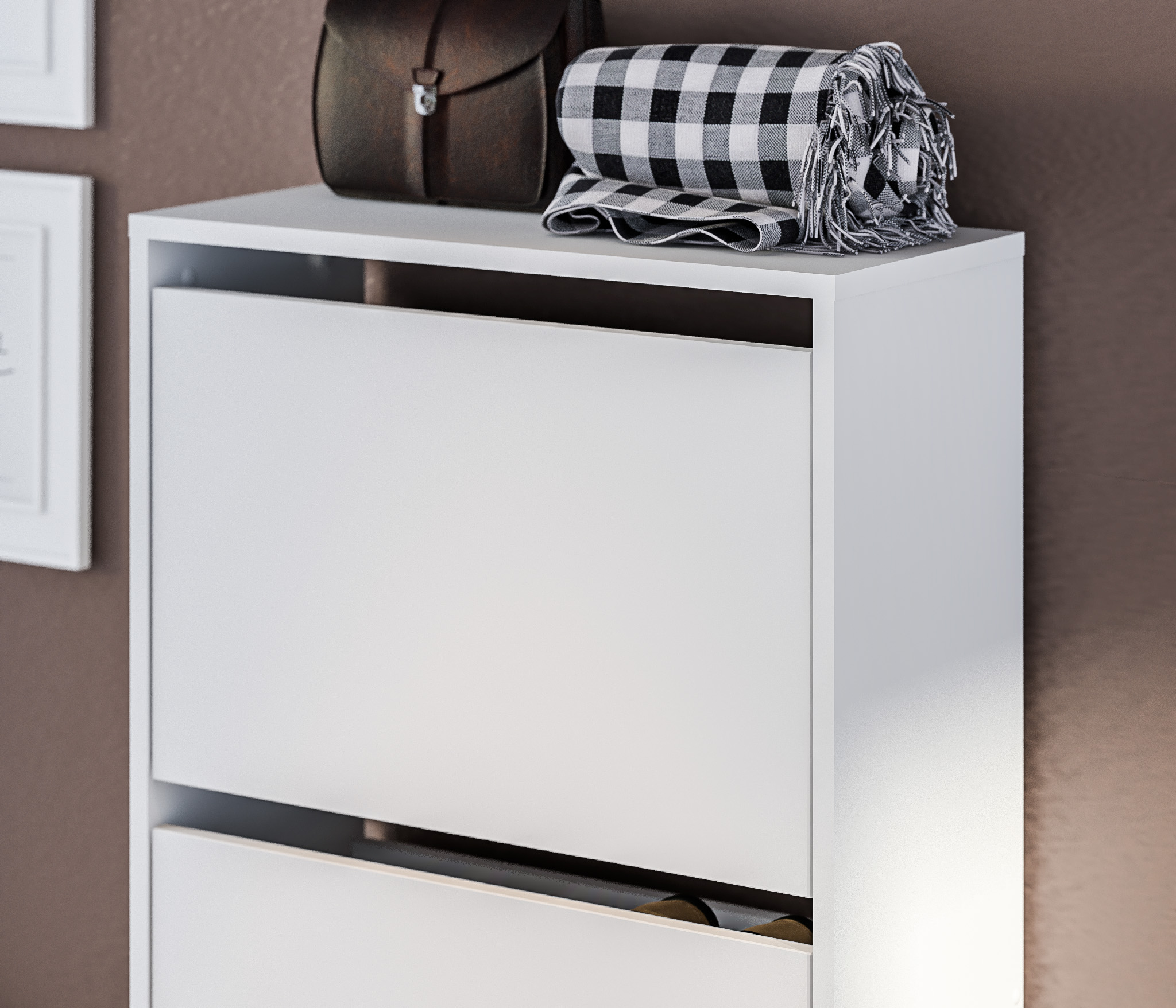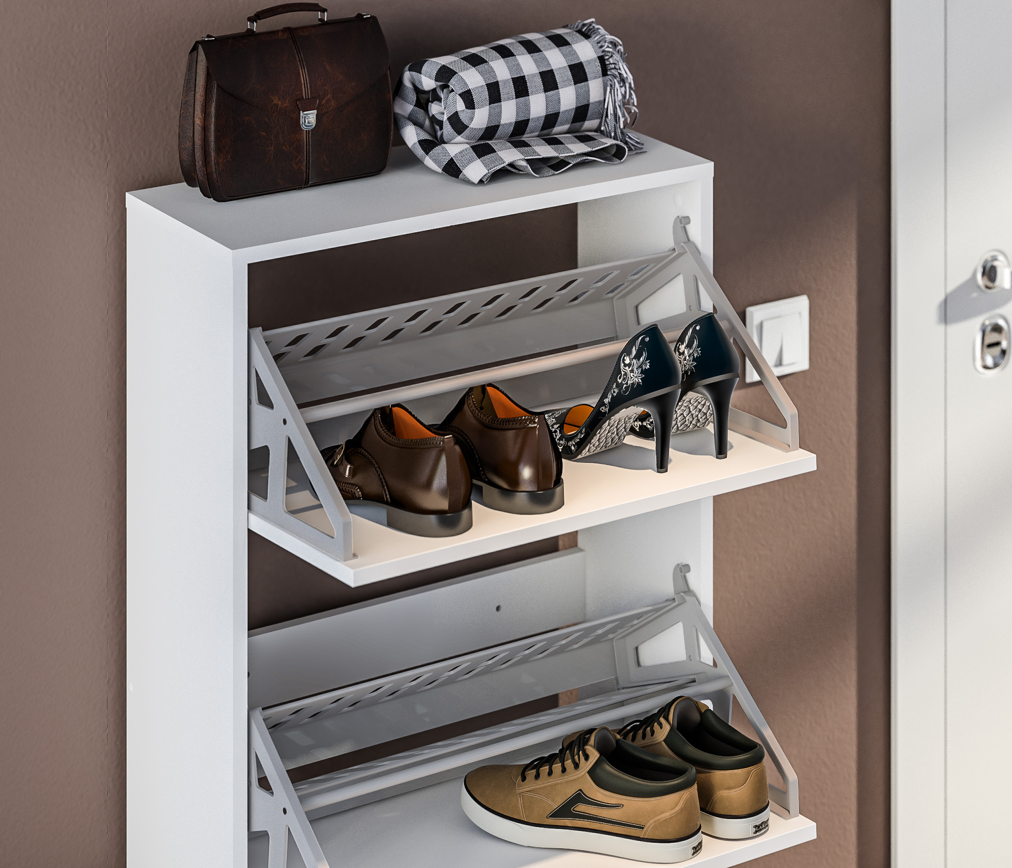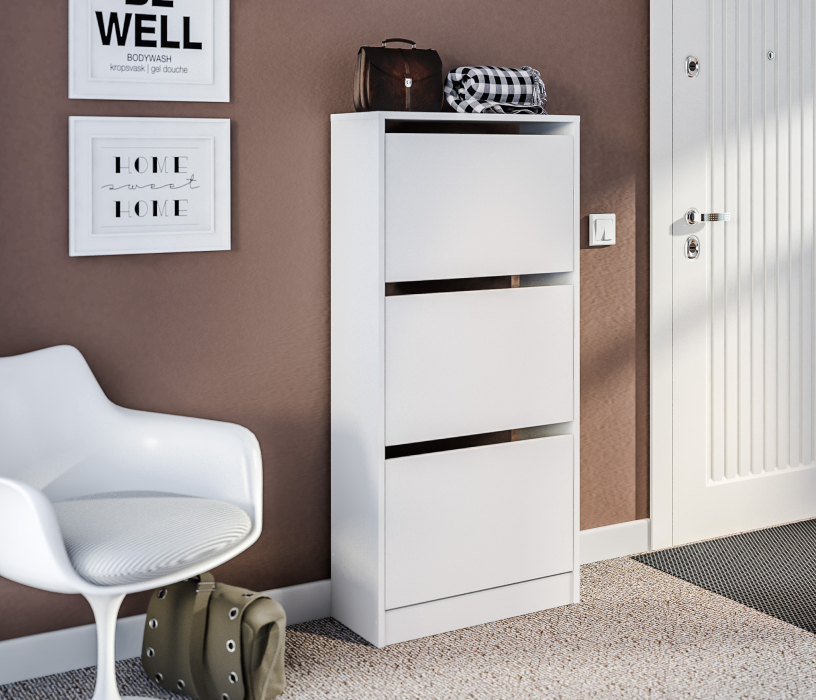 Габаритные размеры – ширина 59 см, высота 126 см и глубина 25 см. Обувница имеет три отделения, каждое из которых оснащено специальными стойками для хранения обуви. Отсутствие ручек и строгие геометрические формы позволяют вписать обувницу в любой интерьер. Обувница произведена из экологичного прочного КДСП, устойчивого к мелким механическим повреждениям. Отделка выполнена в белом цвете.
