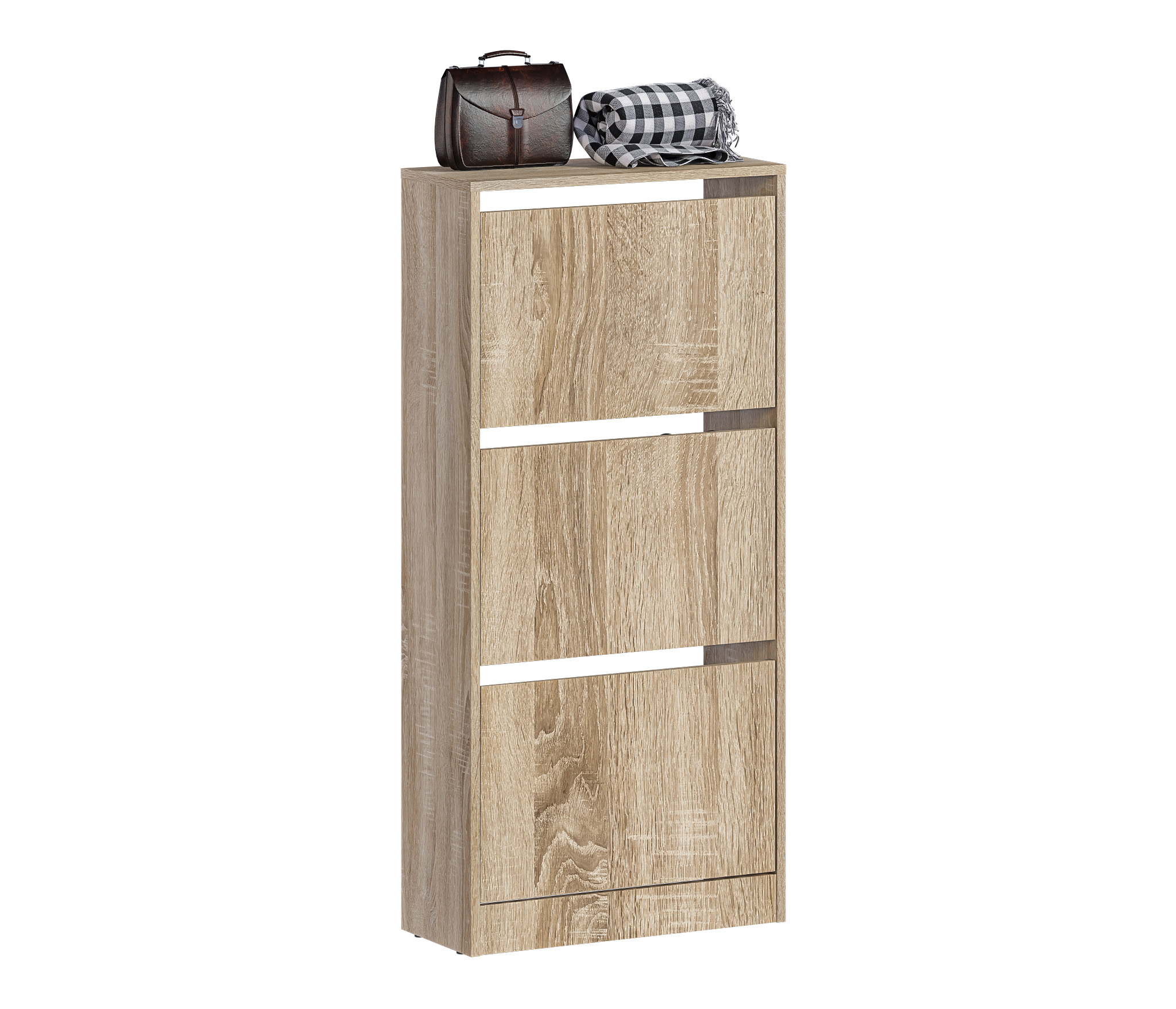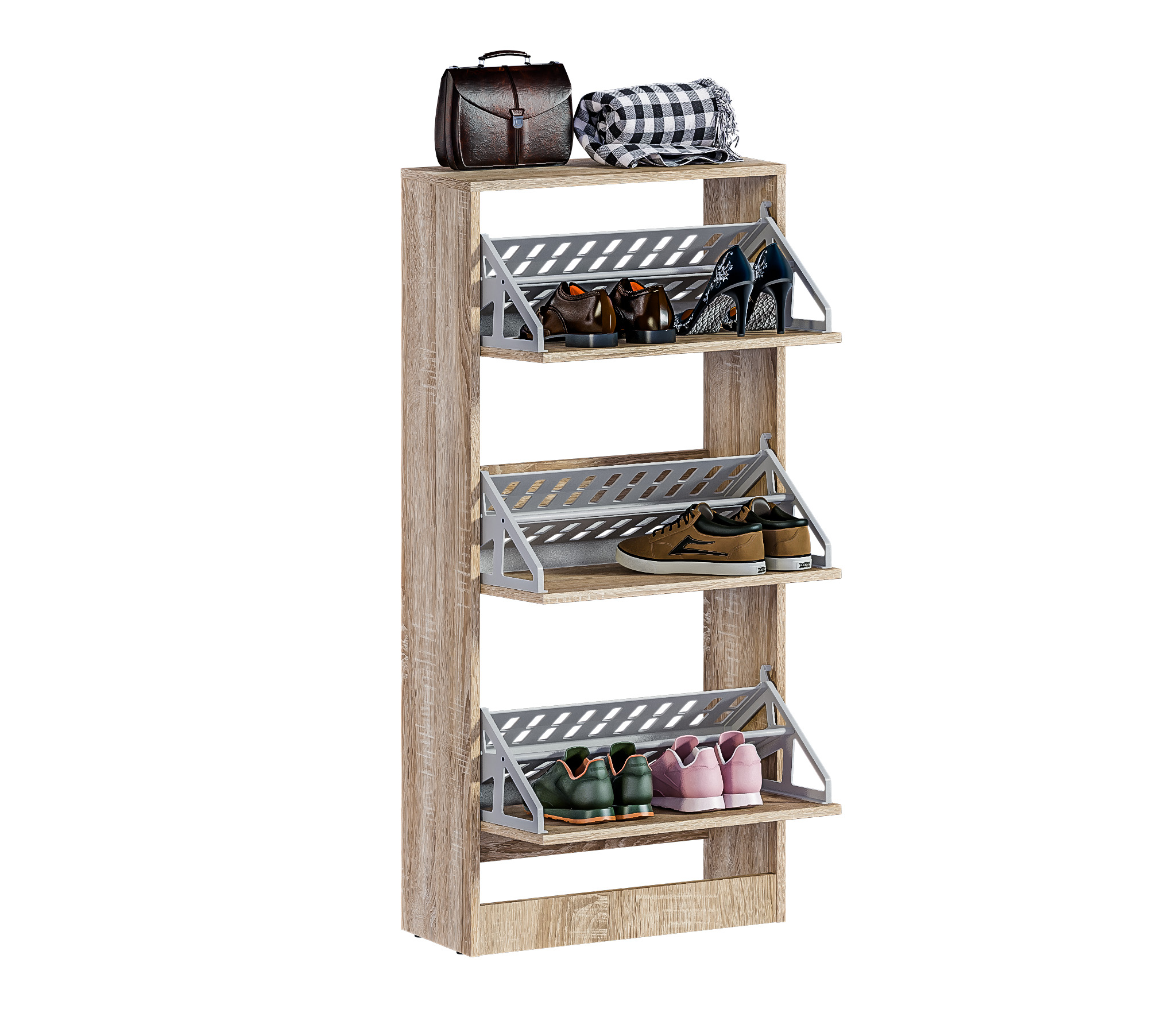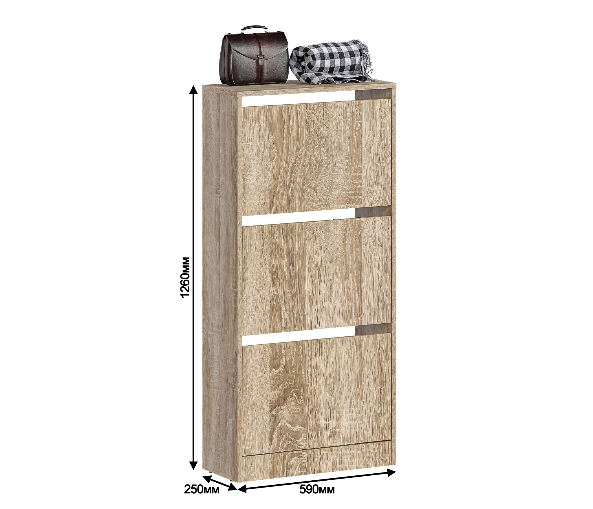 Габаритные размеры – ширина 59 см, высота 126 см и глубина 25 см. Обувница имеет три отделения, каждое из которых оснащено специальными стойками для хранения обуви. Отсутствие ручек и строгие геометрические формы позволяют вписать обувницу в любой интерьер. Обувница произведена из экологичного прочного КДСП, устойчивого к мелким механическим повреждениям. Отделка выполнена в цвете "Дуб Сонома".