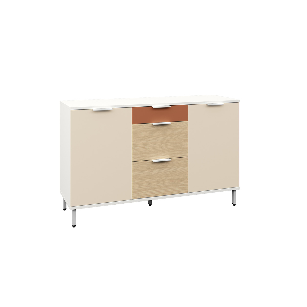 Комод Mika / Мика СБ-3282 – компактное и универсальное место хранения. Комод выполнен в современном сканди дизайне и является элементом модульного гарнитура Мика. Серия разработана для детских комнат или комнат подростков, хотя такой комод будет органичным и в офисе, и в кабинете. Габаритные размеры – ширина 85 см, высота 76 сам, глубина 40 см. Визуально комод можно разделить на две половины. Под одной дверцей расположено отделение с двумя полками. Другая половина оснащена двумя выдвижными ящиками и одним большим выдвижным ящиком на колесиках. Материал корпуса – ЛДСП с отделкой в цвете «Белый Альпийский». Фасады также из ЛДСП с комбинированной отделкой в цветах «Белый Альпийский» и «Серый перламутровый».
