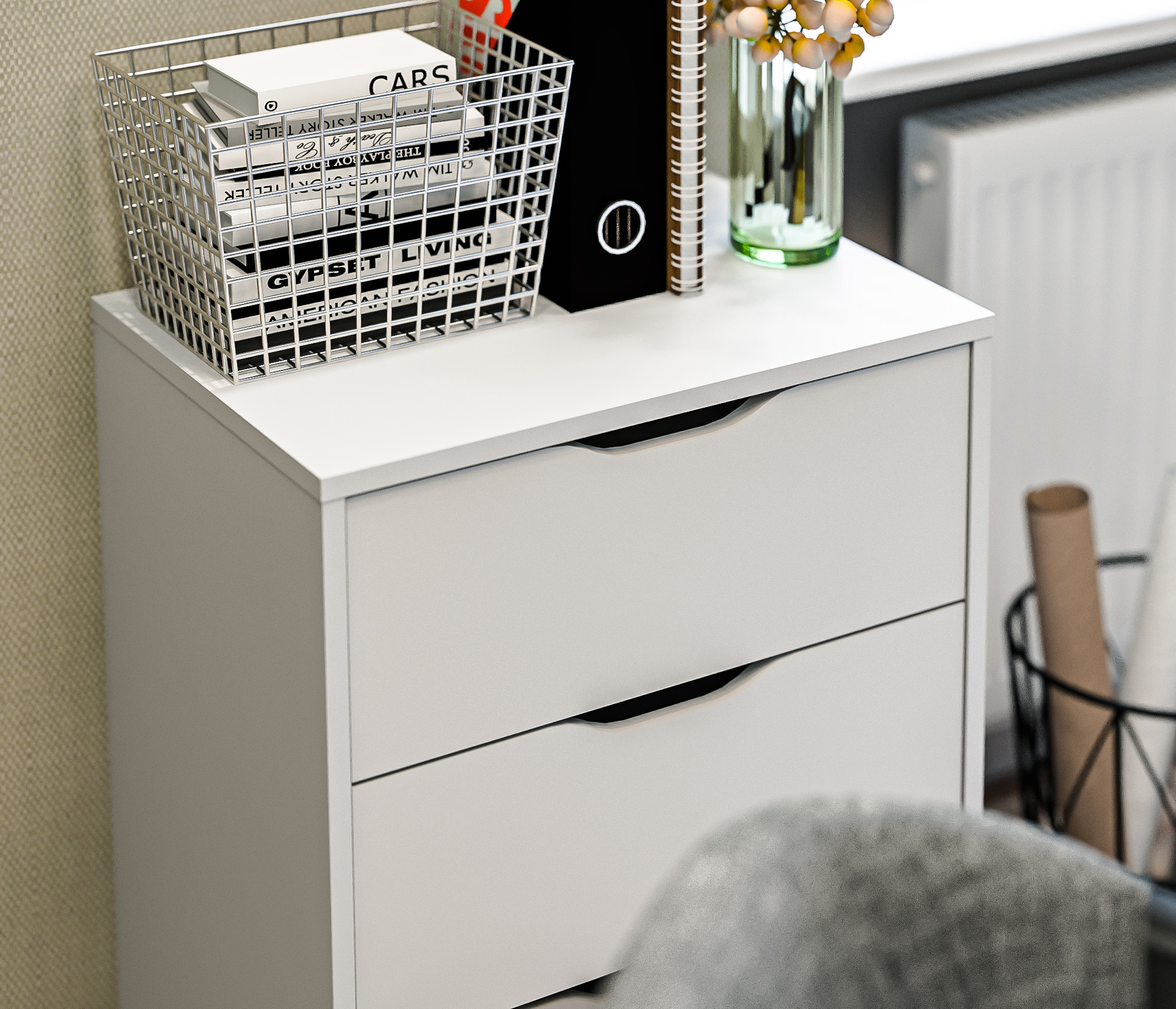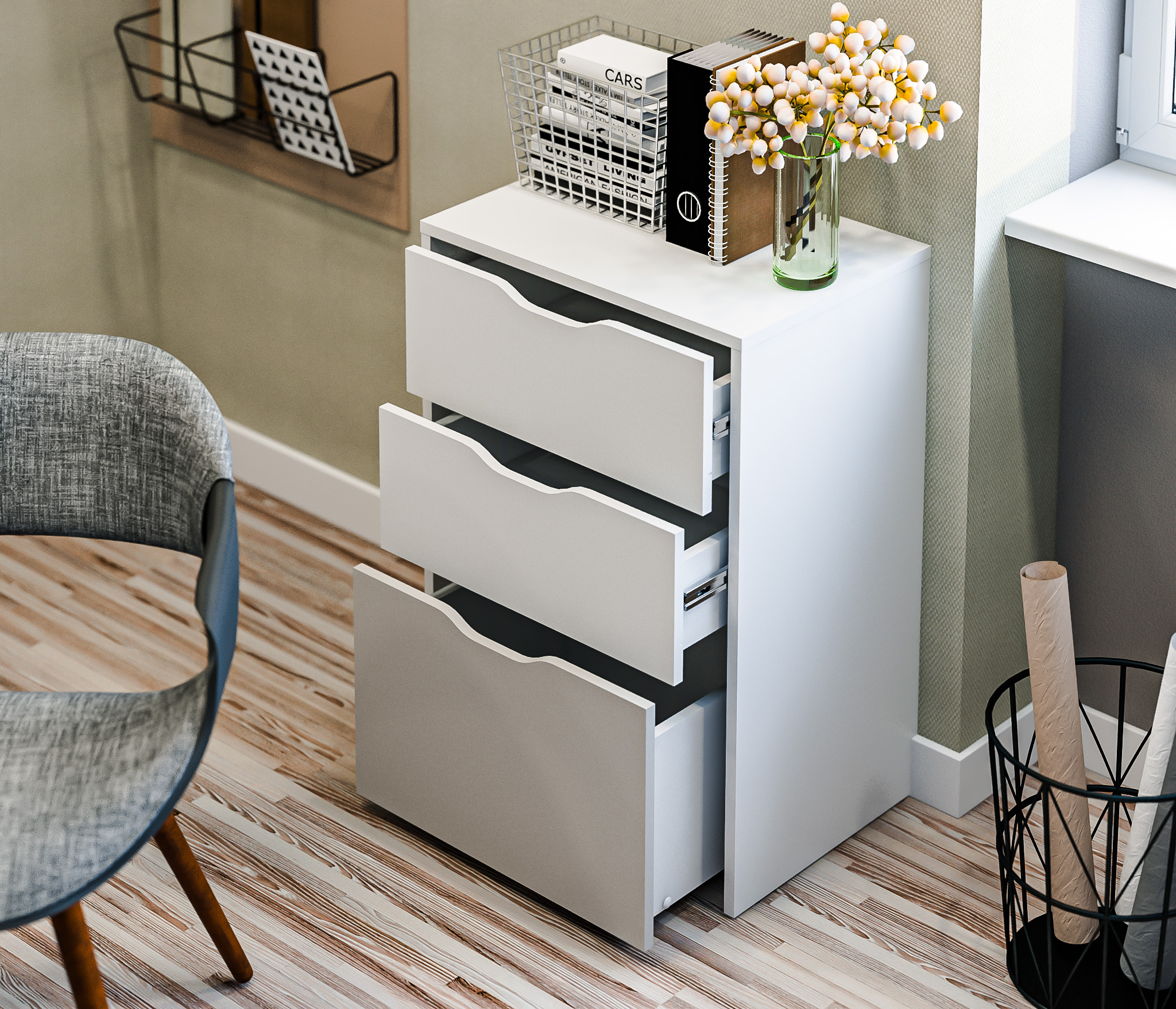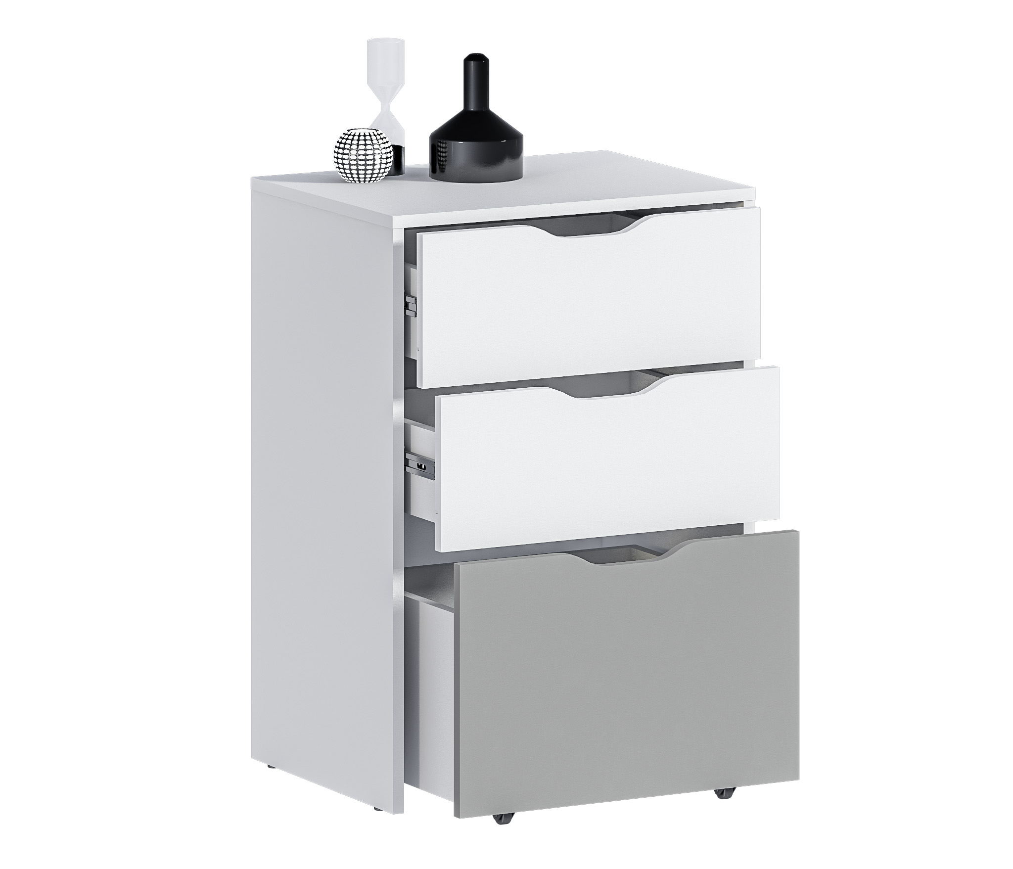Комод Mika / Мика СБ-3283 – компактная и современная система хранения. Комод является составной частью модульного гарнитура Мика, но вполне может быть использован как автономный предмет мебели. Будет одинаково органичен в кабинете, офисе, детской комнате или комнате подростка. При компактных габаритных размерах – ширина 53 см, высота 76 см, глубина 40 см, комод довольно вместителен. Он оснащен двумя выдвижными ящиками и нижним выдвижным ящиком на колесиках. Материал корпуса – ЛДСП с отделкой в цвете «Белый Альпийский». Фасады также из ЛДСП с комбинированной отделкой в цветах «Белый Альпийский» и «Серый перламутровый».