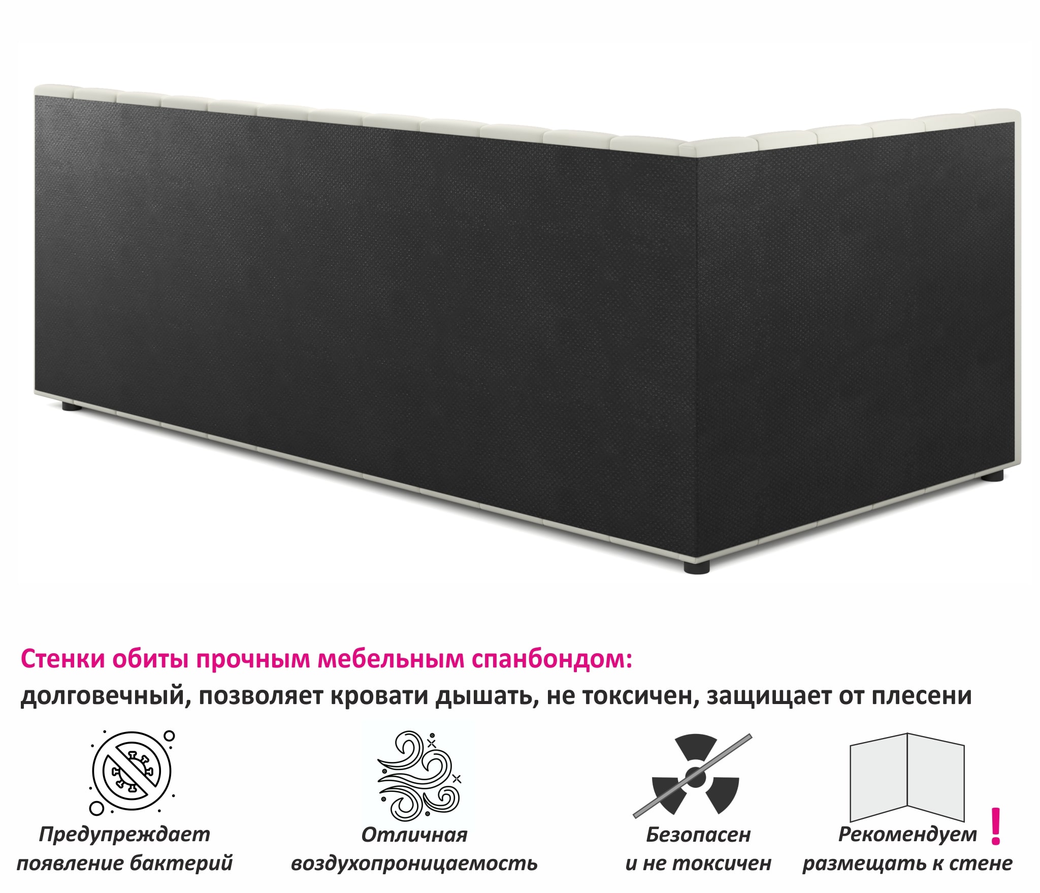 • Высокие стенки обшиты сзади спанбондом. Рекомендуем размещать кровать к стене. Кровать поставляется в разобранном виде. Требует дополнительное сборки.