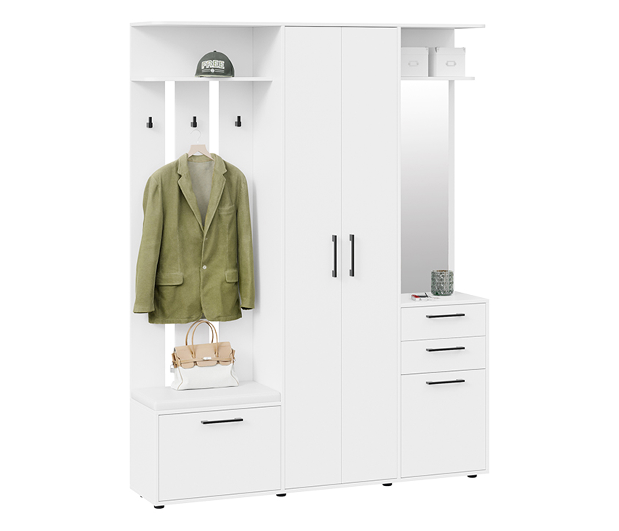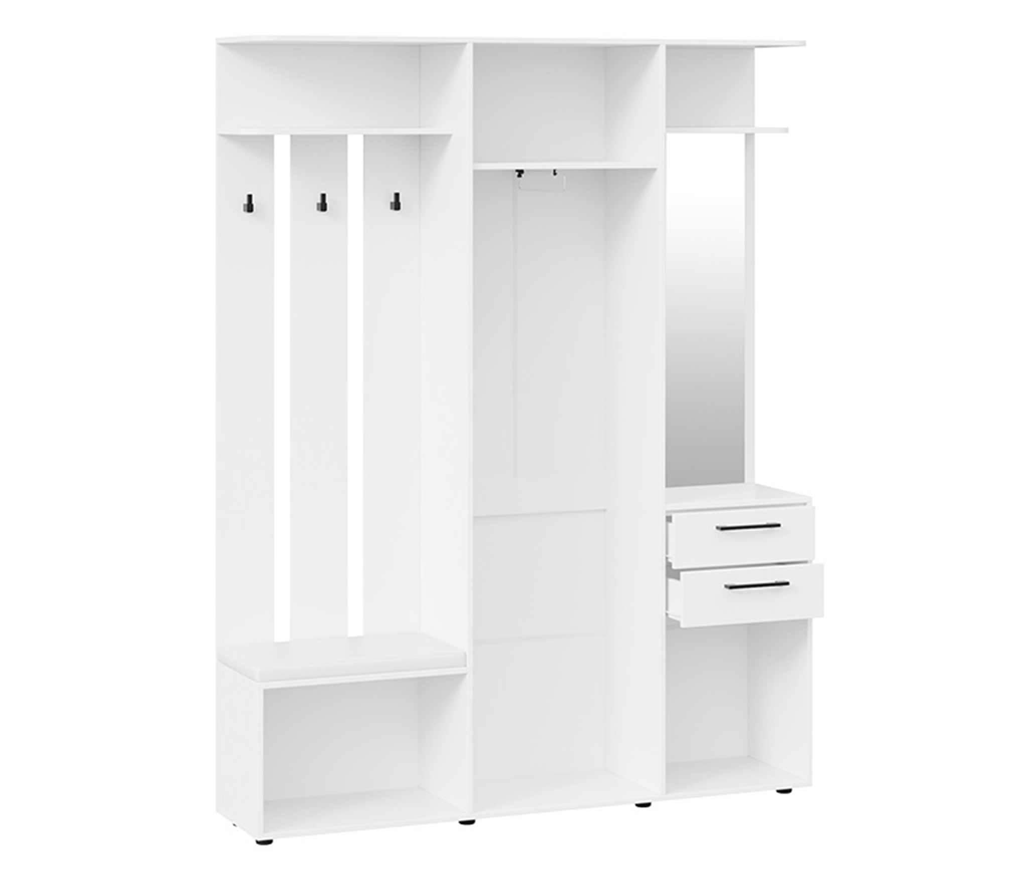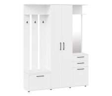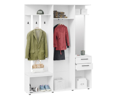 Удачная модель для прихожей: многофункциональя прихожая небольшого размера. Конструкция включает в себя закрытый шкаф с выдвижной штангой , модуль с открытими крючками, выдивижные ящики и закрытые ниши.