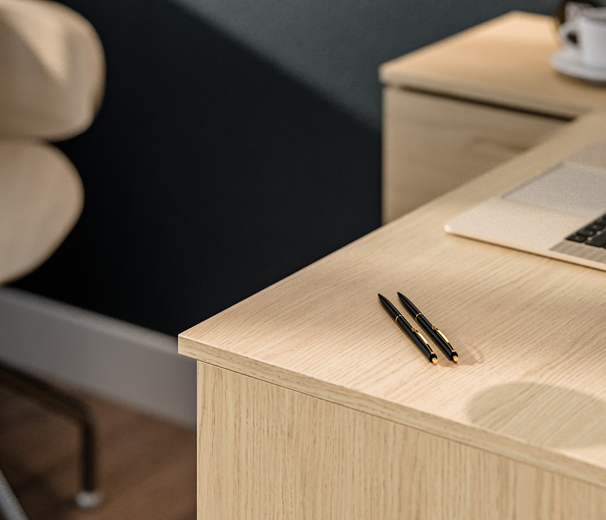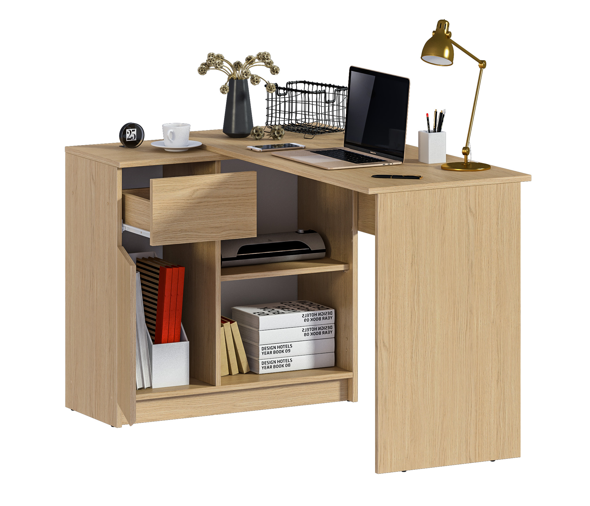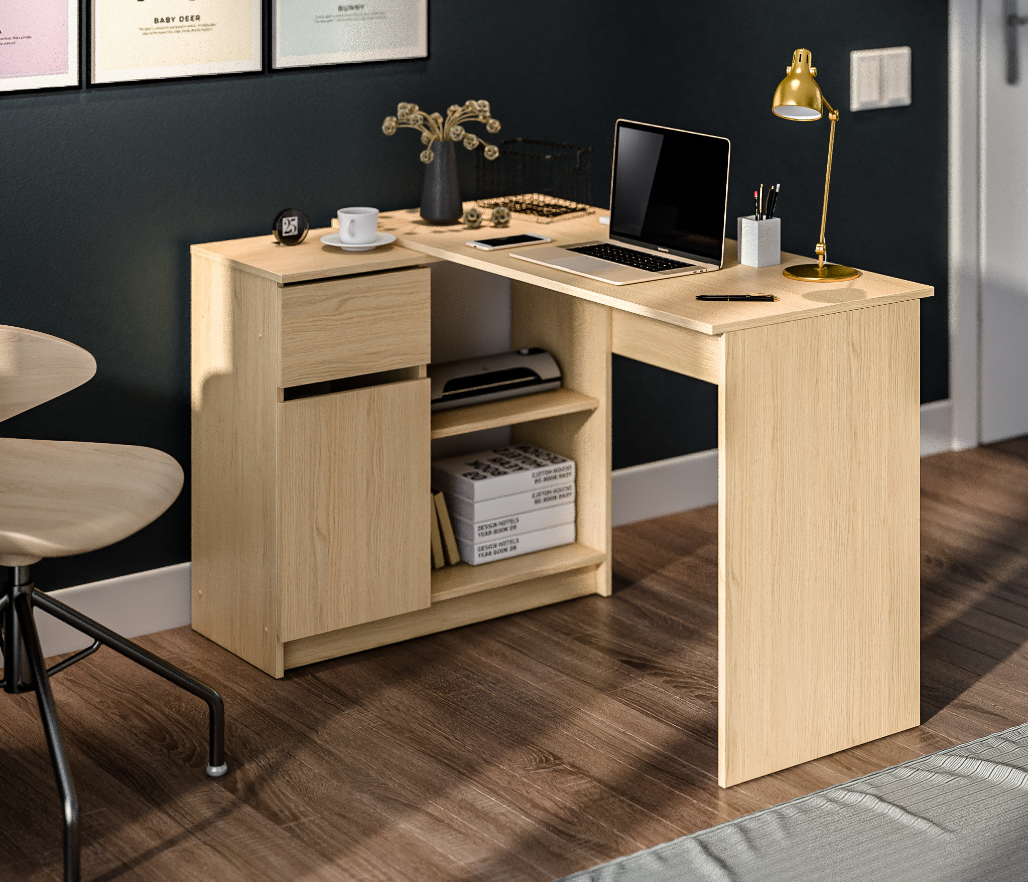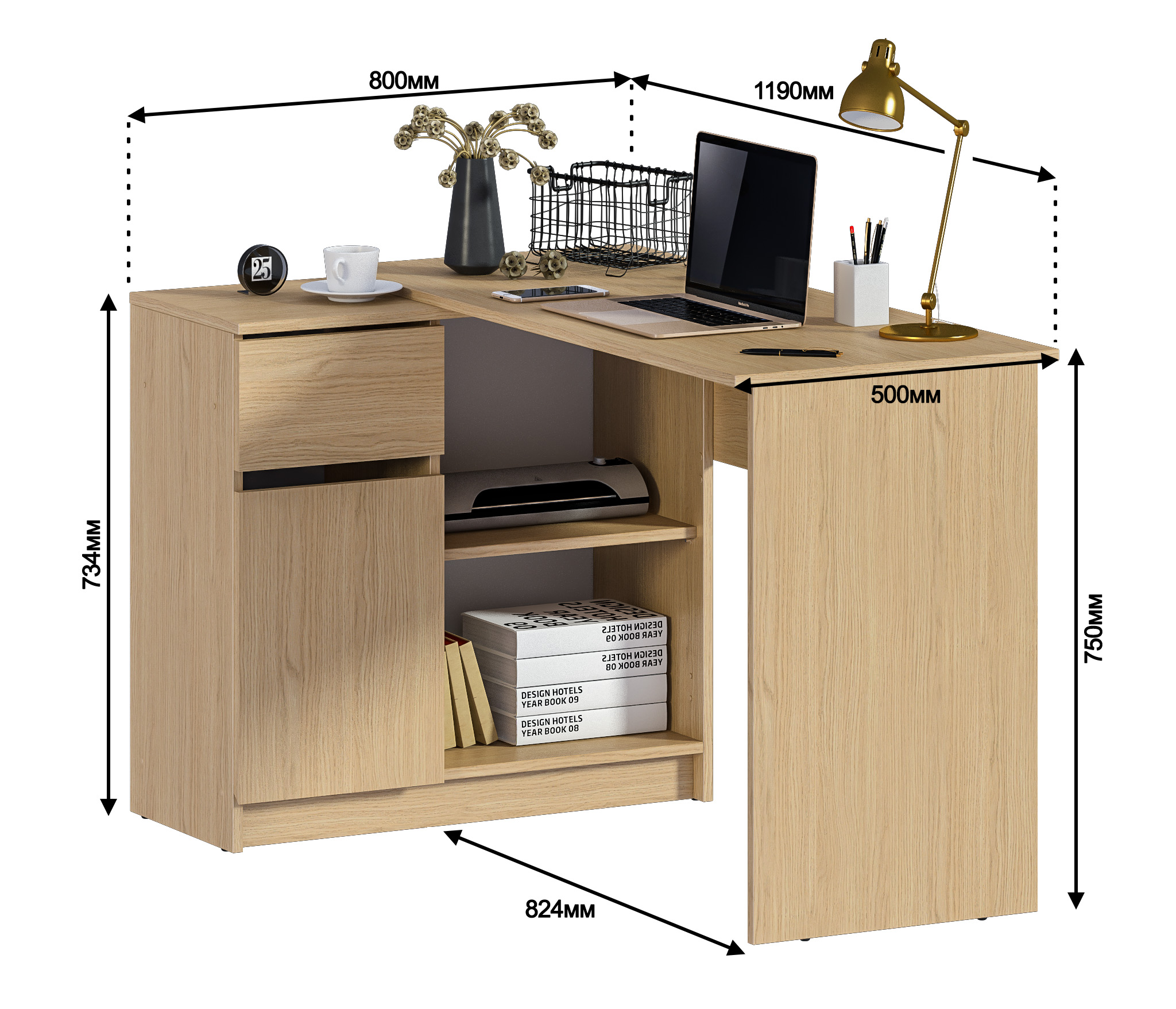 Габаритные размеры – ширина 119 см, высота 75 см и глубина 80 см. Под рабочей поверхностью расположена тумба с открытыми вместительными полками, а также выдвижной ящик и закрытое отделение с отдельной дверцей. Стол произведен из современного экологичного ЛДСП. Возможен как левый, так и правый вариант сборки.